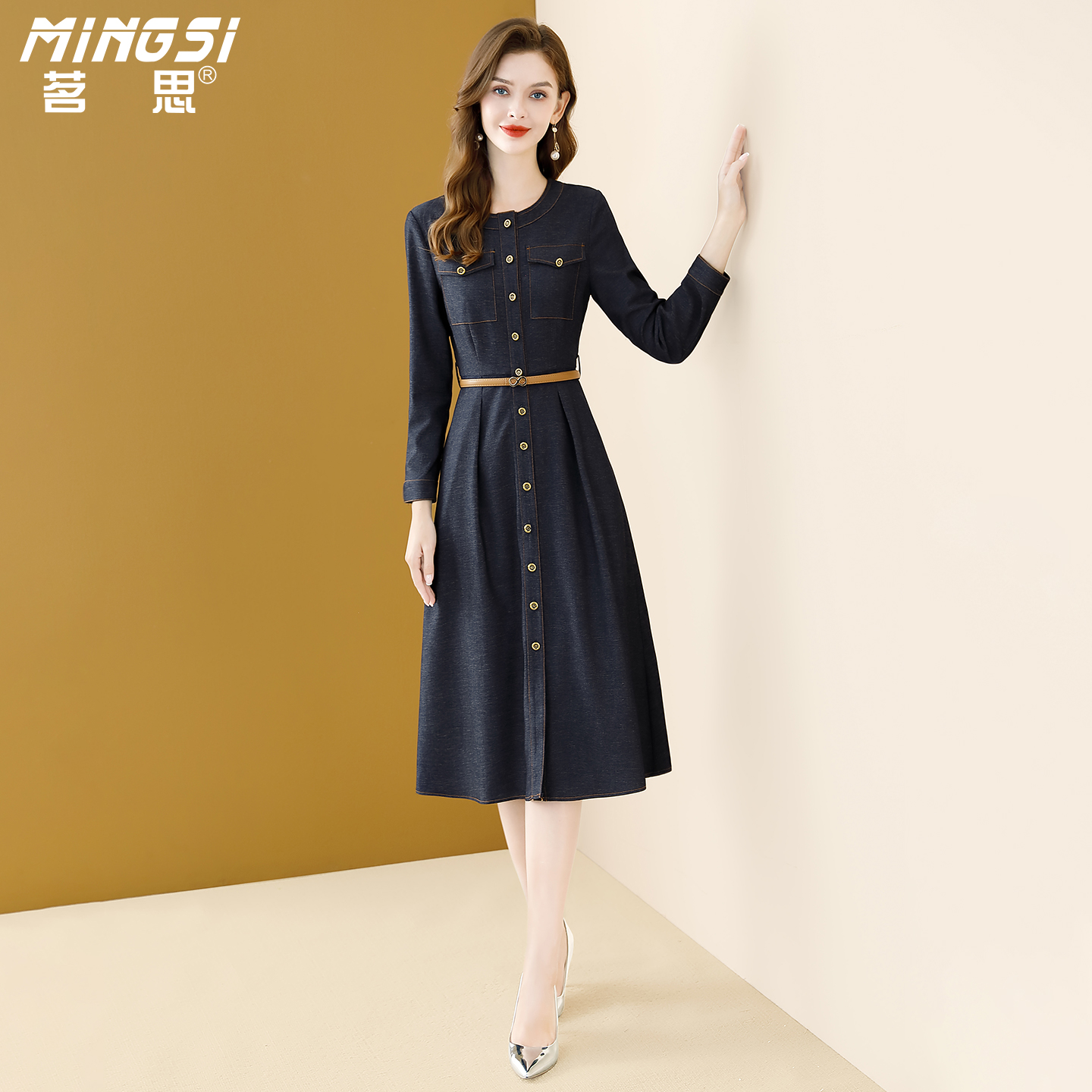 茗思复古蓝色牛仔连衣裙2025秋季新款长袖收腰显瘦单排扣气质裙子