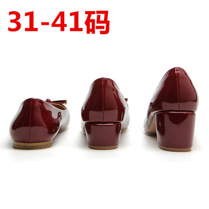 圆头小皮鞋中跟酒红色蝴蝶结粗跟漆皮单鞋婚鞋女平底小码31 32 33