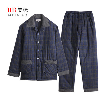 美标男士三层加厚夹棉纯棉睡衣套装秋冬保暖休闲格子全棉质家居服