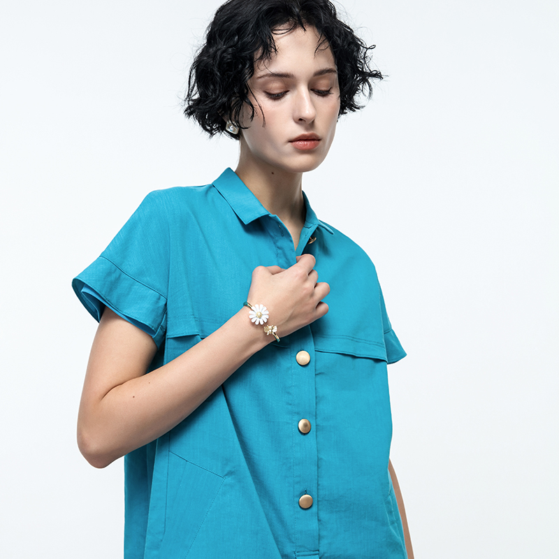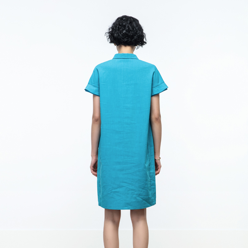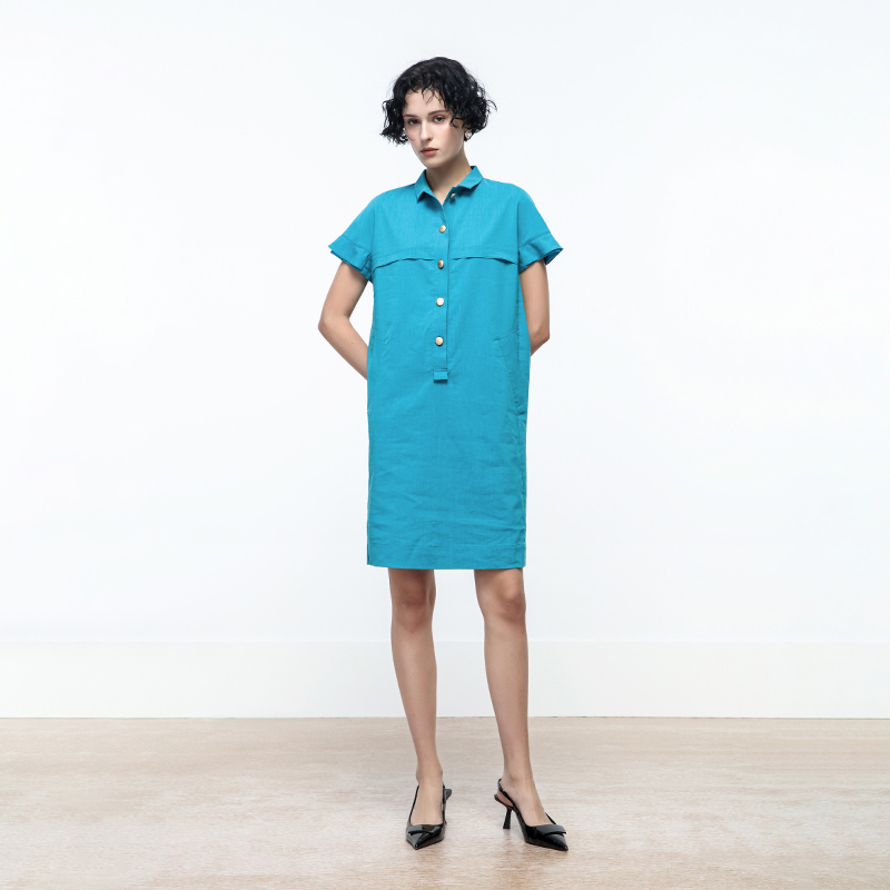 Keywearcloud奇威夏季中长款连衣裙宽松简约廓形短袖单排扣洋装