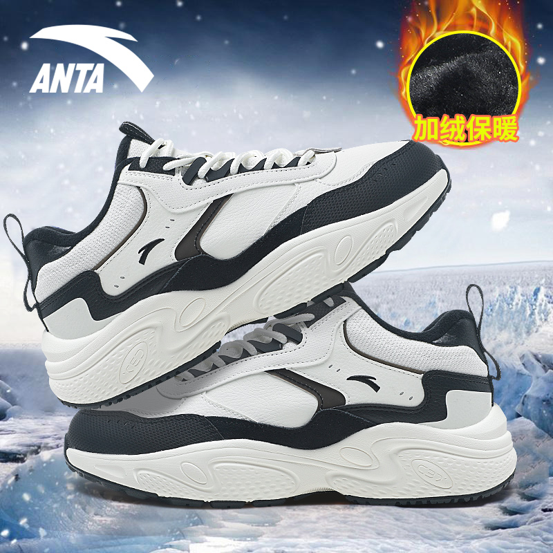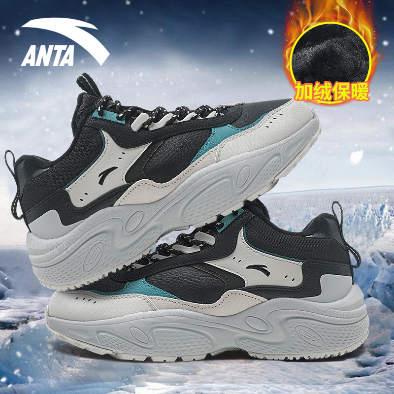 安踏男鞋加绒运动鞋冬季2025新款黑色皮面防水老爹鞋加厚保暖棉鞋