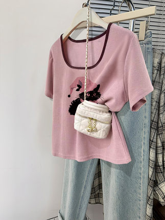 法式方领T恤女装夏季2024新款小众大码短款短袖ins潮正肩辣妹上衣
