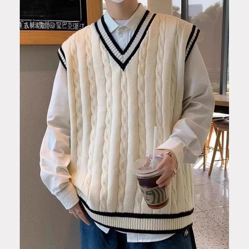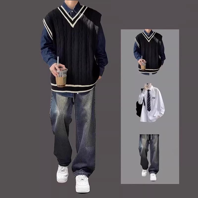 日系潮牌毛衣马甲男女春秋季背心套装学院风宽松学生dk制服三件套