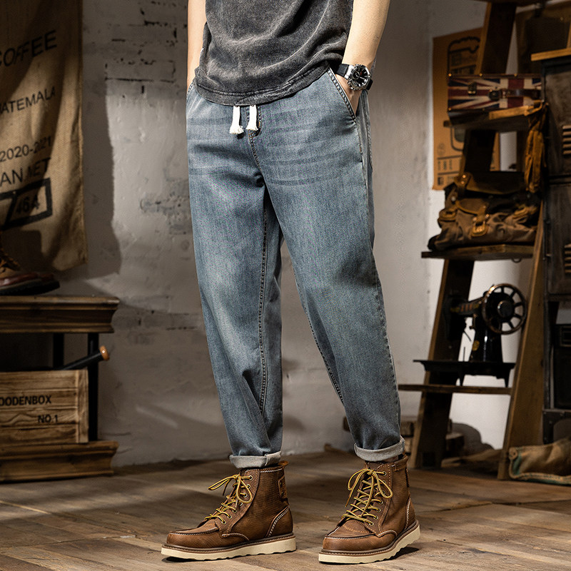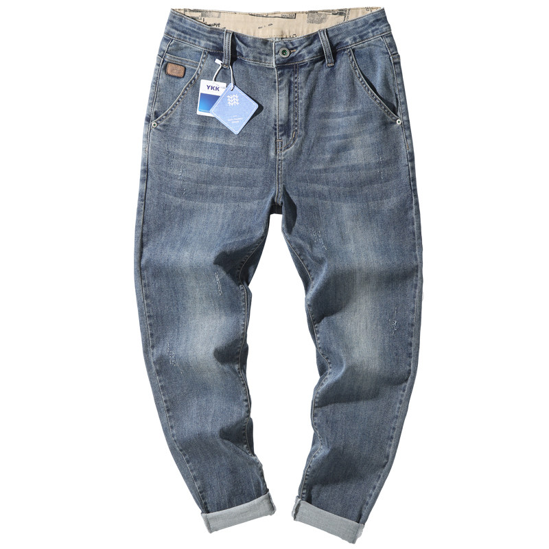 春秋款高弹力宽松九分牛仔裤裤男胖子加肥加大码复古小脚哈伦裤