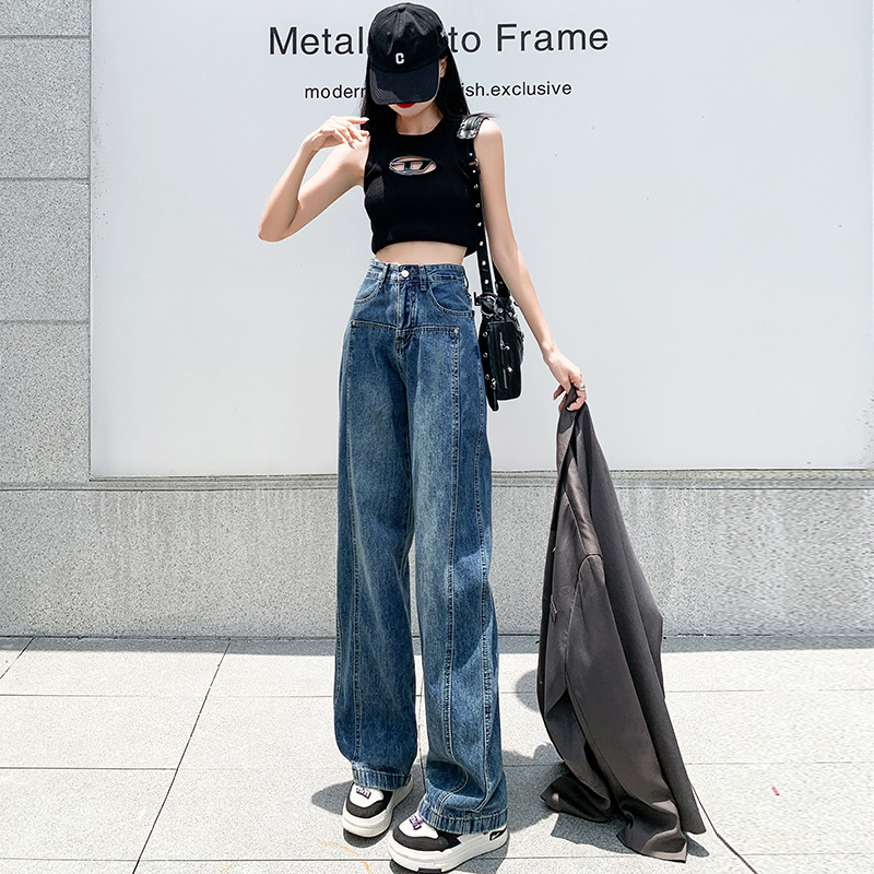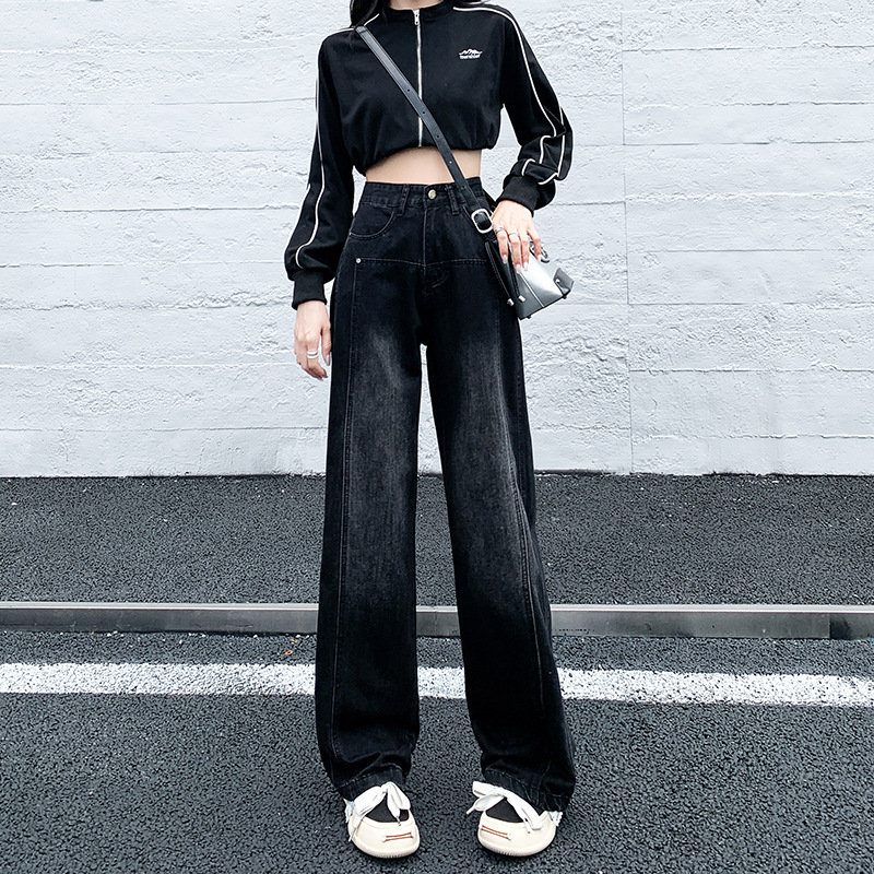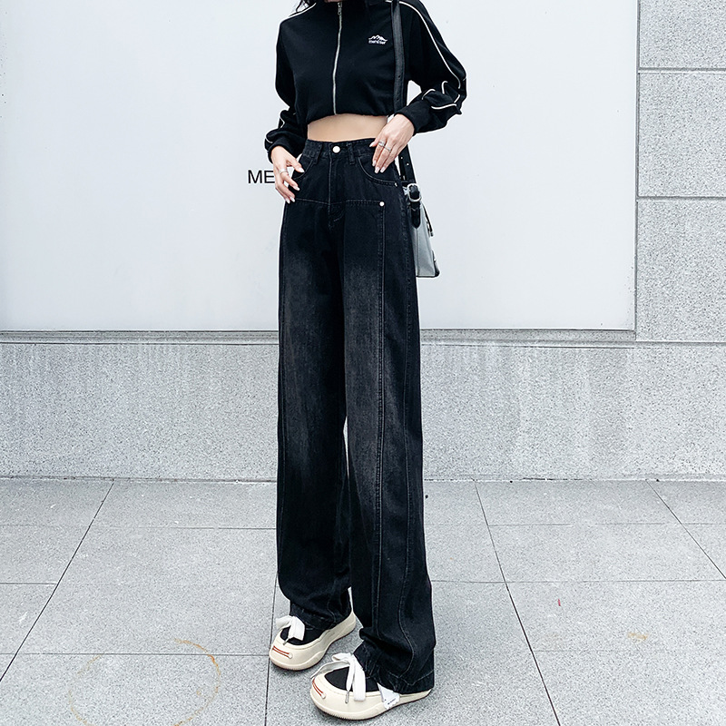 黑灰色阔腿牛仔裤女直筒拖地裤