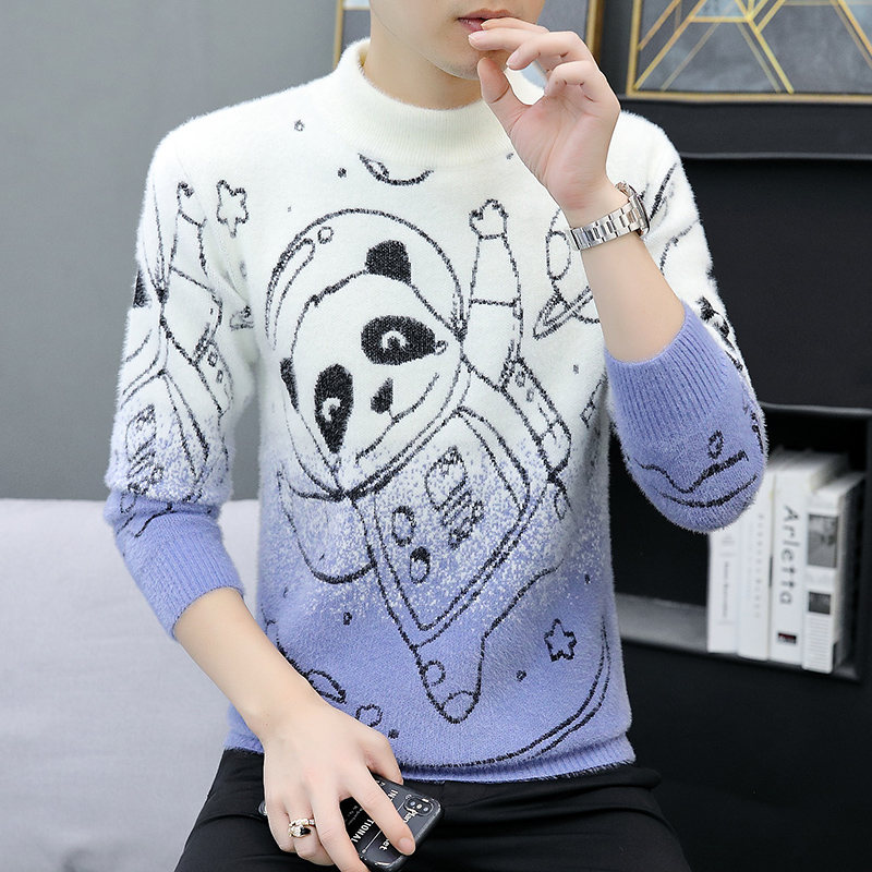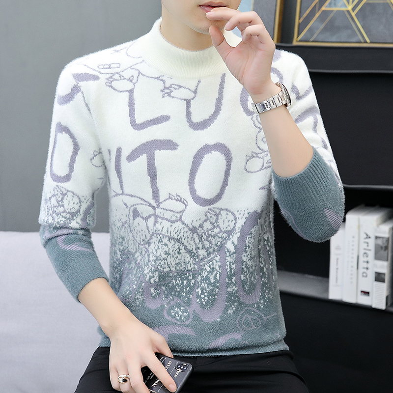 青少年水貂绒毛衣男秋冬季新款加绒加厚保暖半高领潮流内搭针织衫