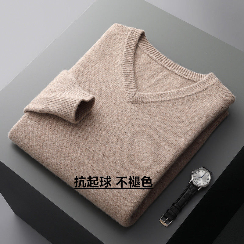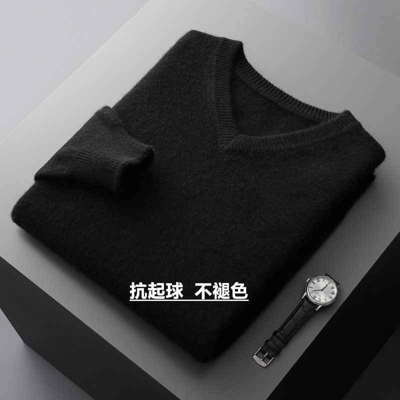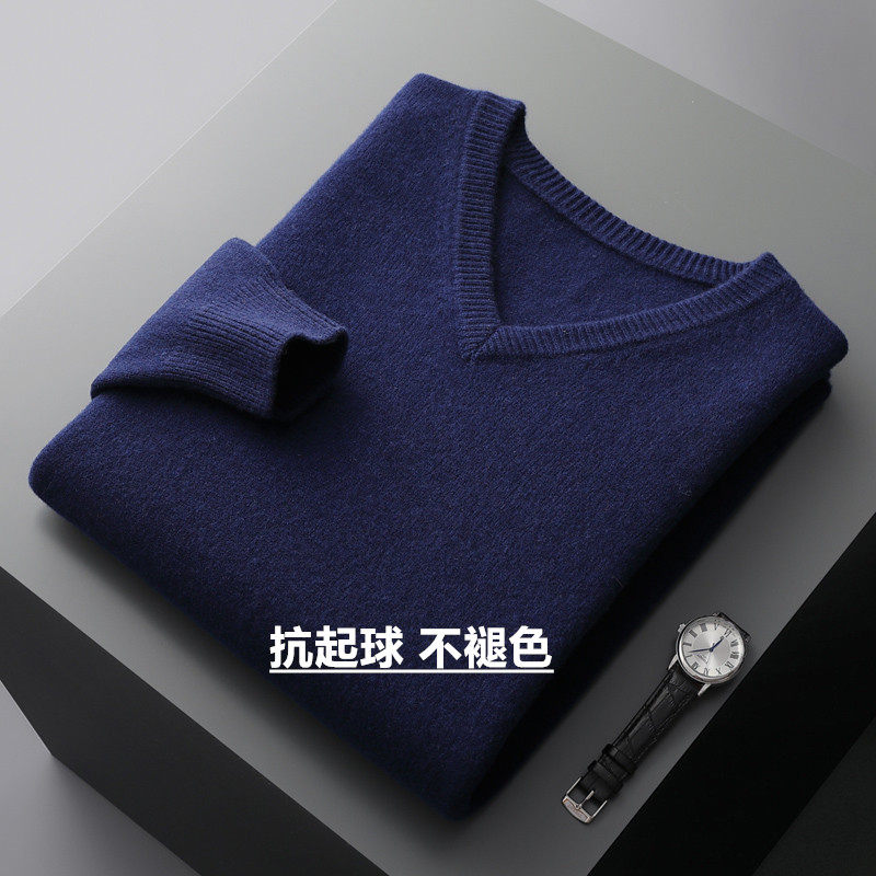 100%纯羊毛衫男士V领加厚毛衣秋冬新款宽松大码鸡心领针织打底衫