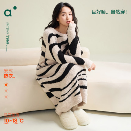 安之伴【巨保暖半边绒】条纹睡裙女秋冬长袖时尚宽松家居服中长款