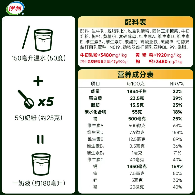 伊利欣活奶粉中老年成人高钙牛初乳增强免疫力高蛋白全家营养奶粉