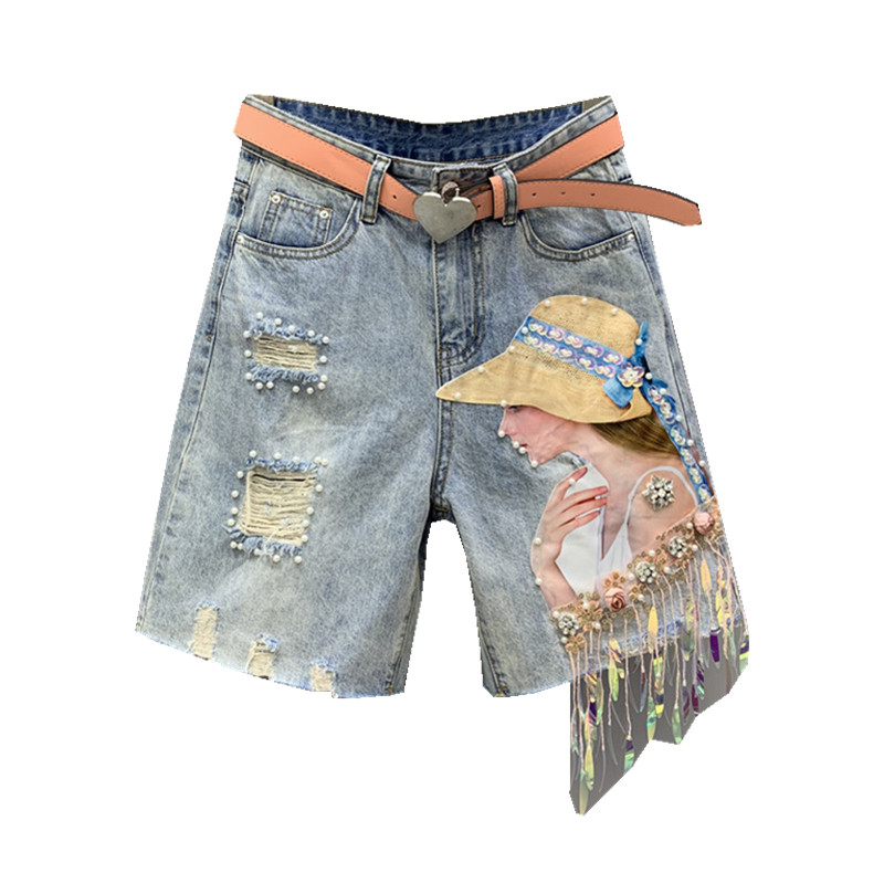 重工美女贴图流苏亮片钉珠破洞五分牛仔短裤女洋气减龄直筒中裤潮