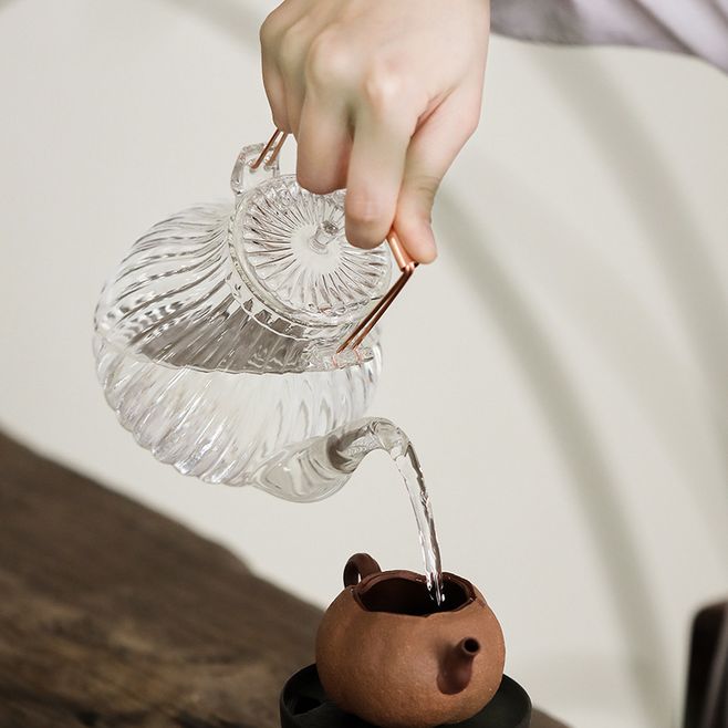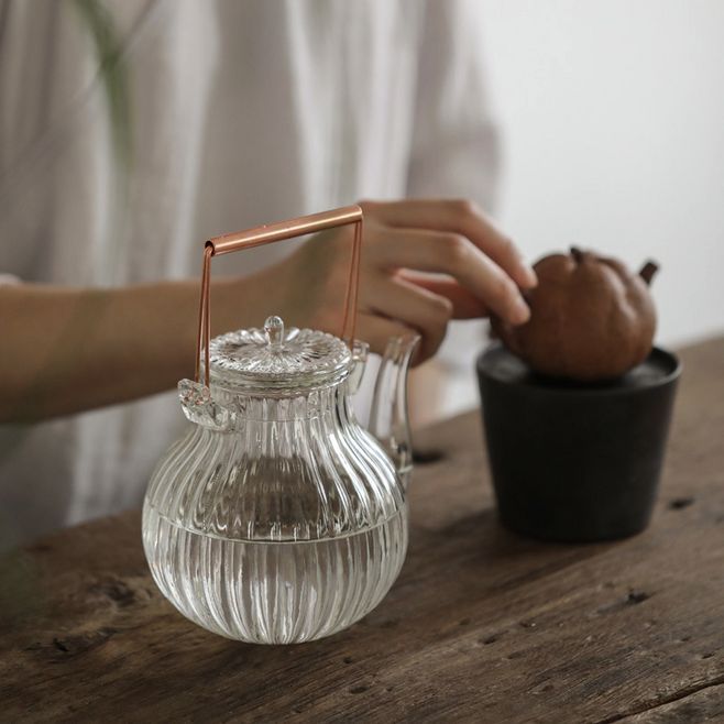 日式简约 菊瓣耐热加厚玻璃茶壶 铜柄提梁玻璃泡茶壶电陶炉专用