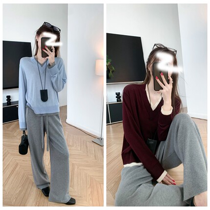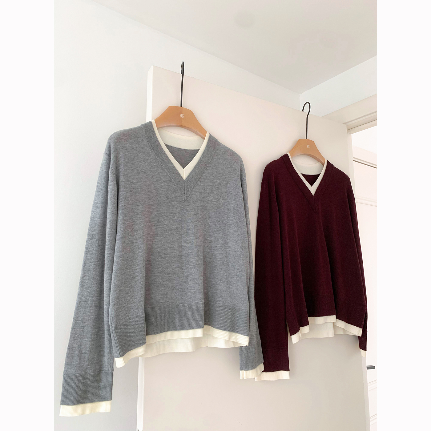 高智感假两件 秋季拼色V领针织衫羊毛混纺宽松套头毛衣休闲随意女