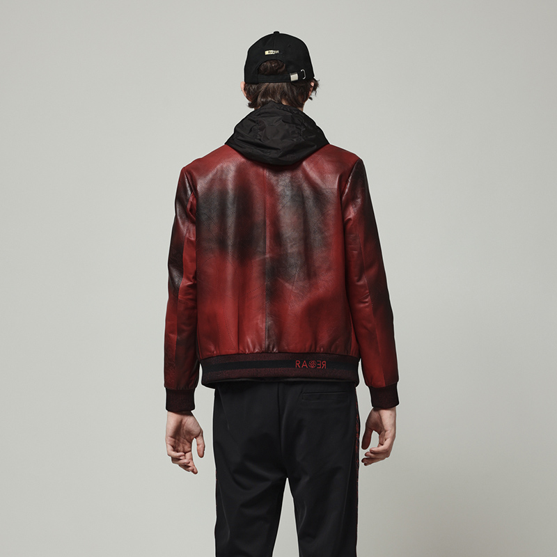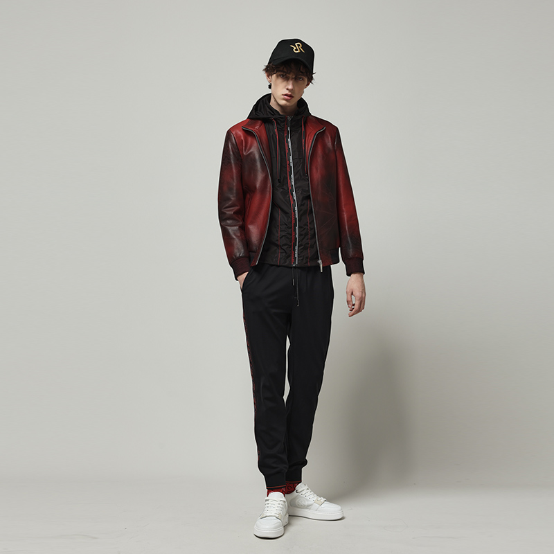 RARE威雅男装 春夏新款红黑色晕染立领休闲款皮衣夹克外套