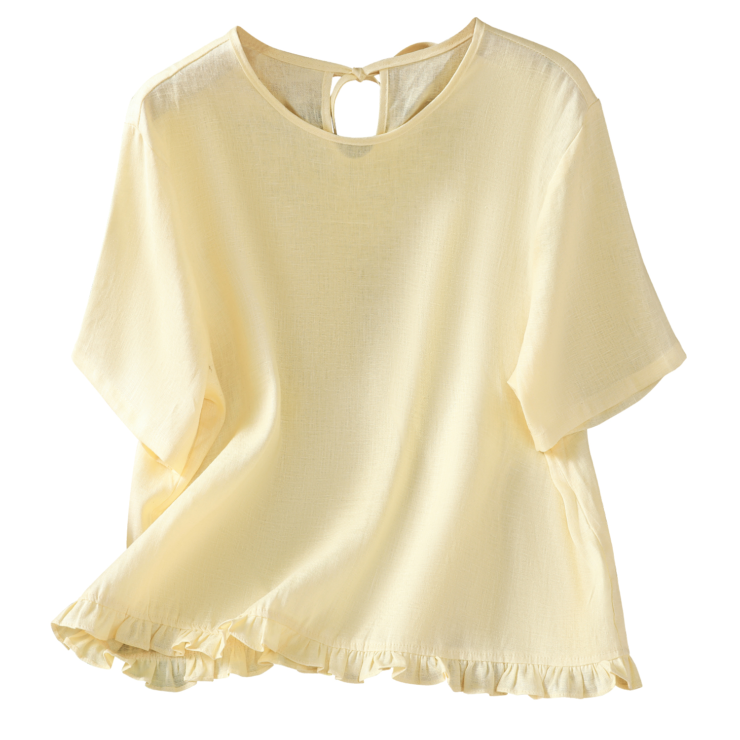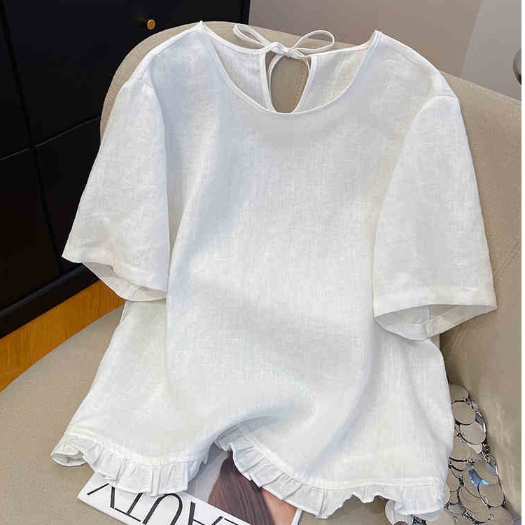 法式花边拼接圆领亚麻短袖衬衫女装夏季新款宽松棉麻小衫休闲上衣