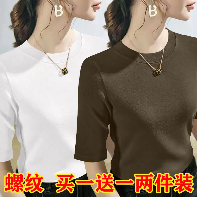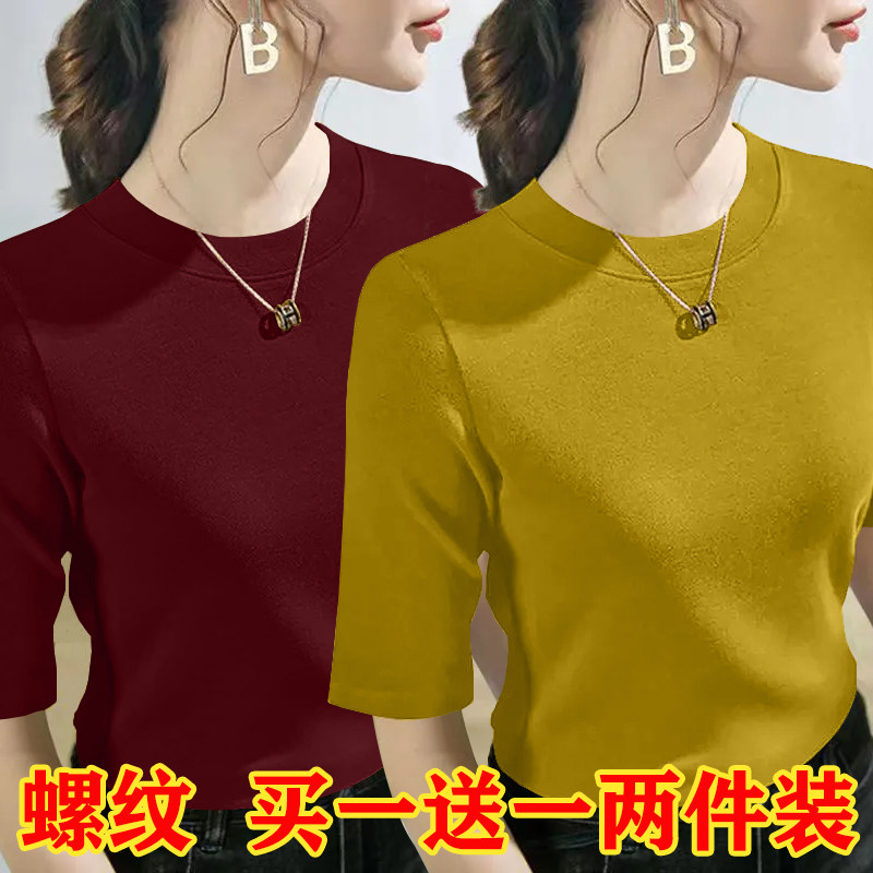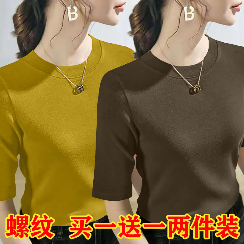 单/两件装2025夏季修身t恤衫上衣百搭女士纯色时尚休闲螺纹五分袖