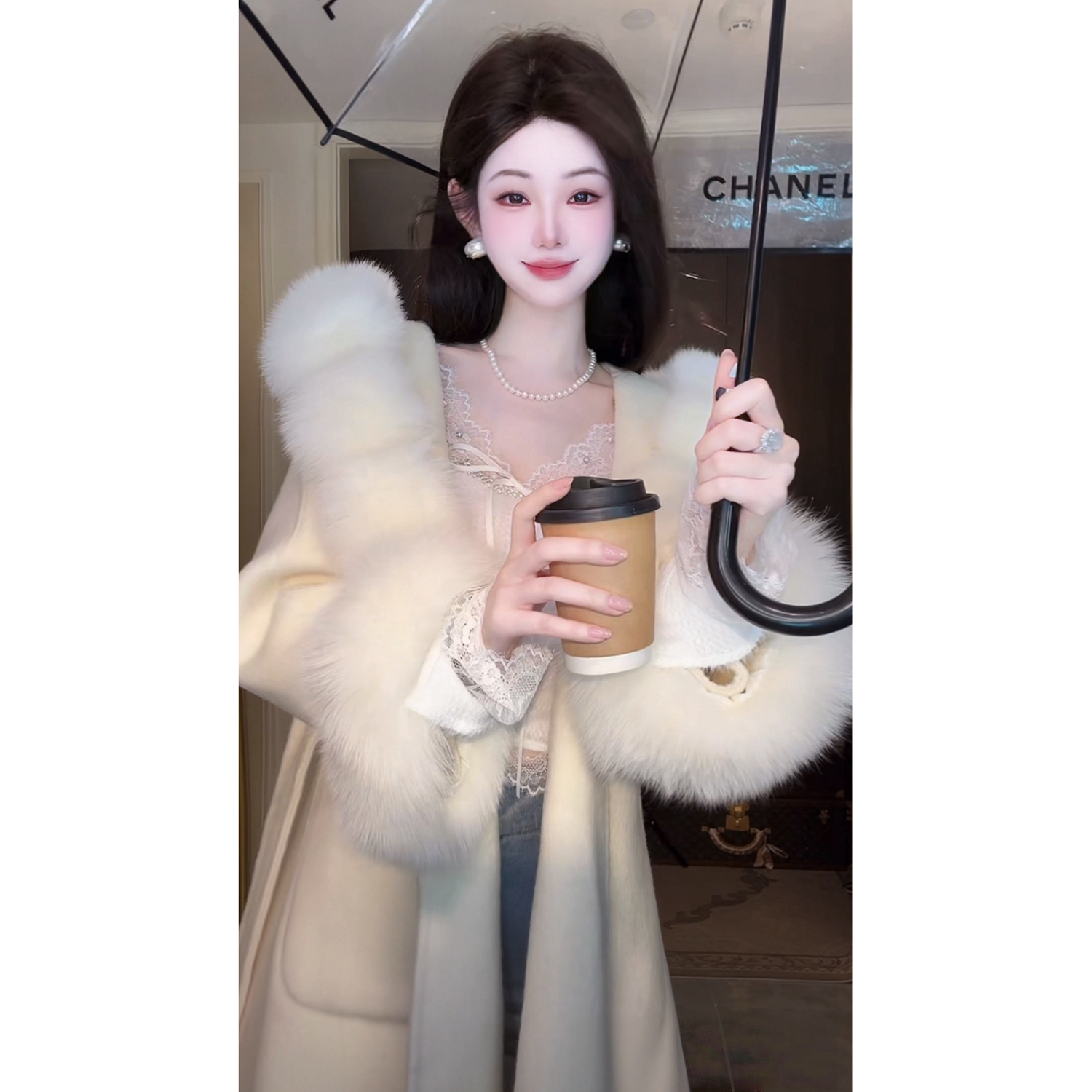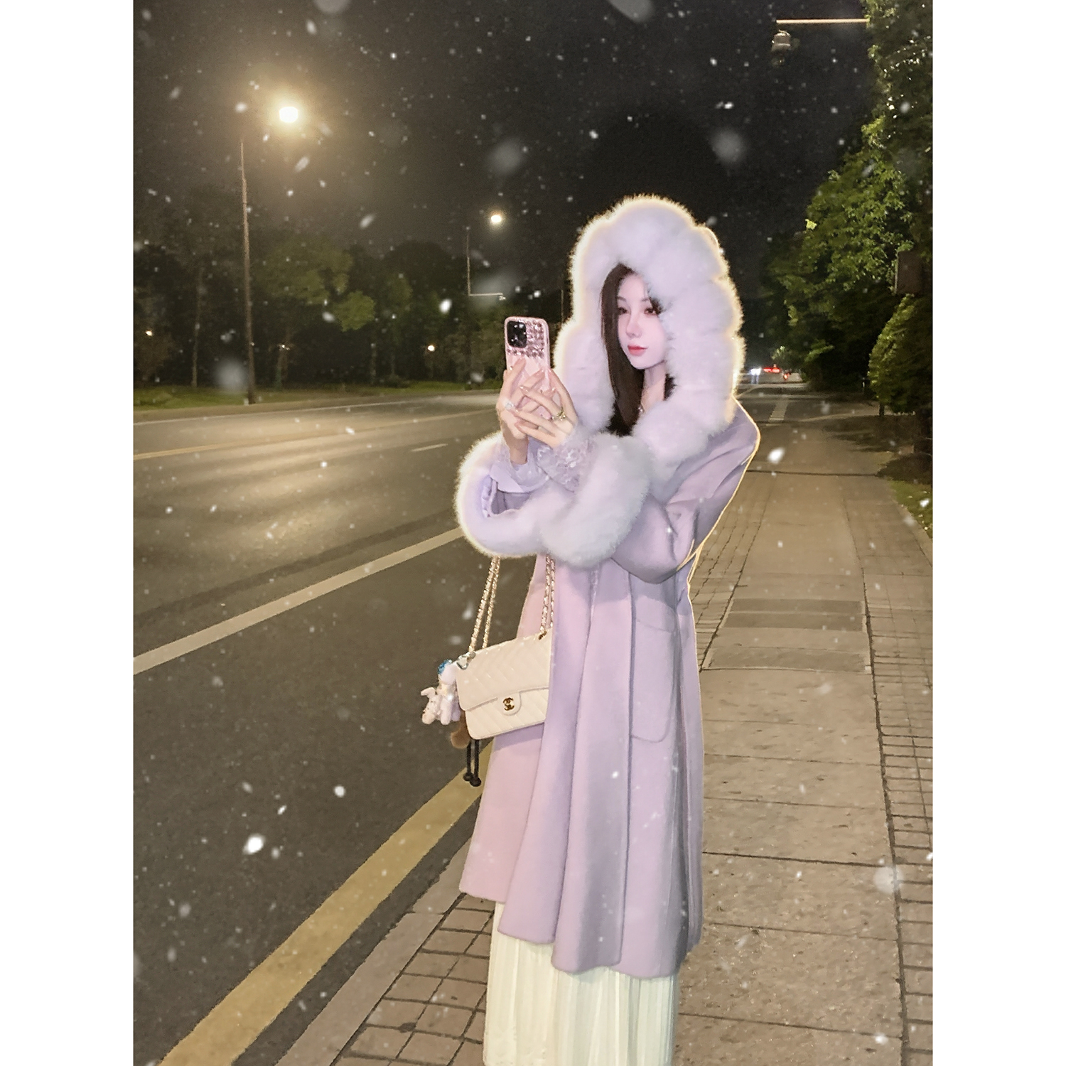 雅乔【依恋】秋冬长袖中长款狐狸毛领连帽双面呢羊毛大衣外套女
