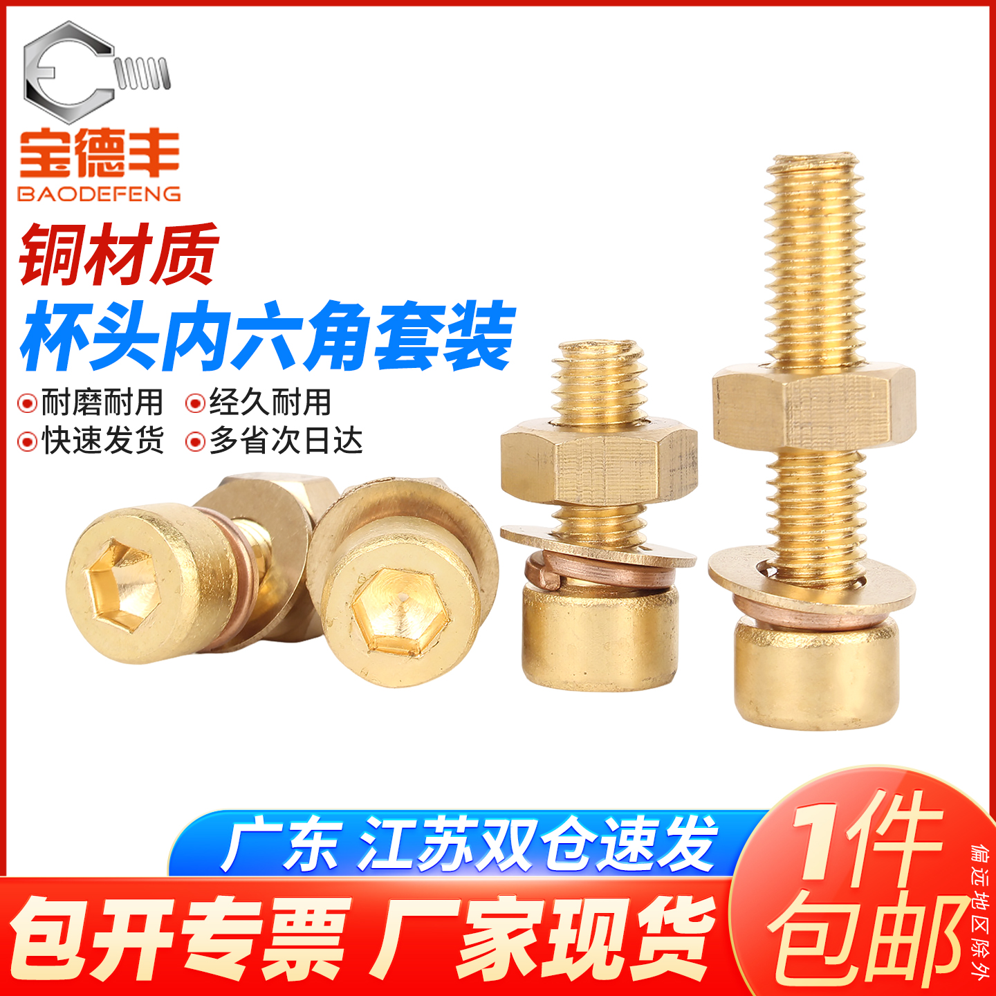 国标黄铜内六角螺丝钉铜螺母螺栓螺帽平垫弹垫片垫圈组合套装大全