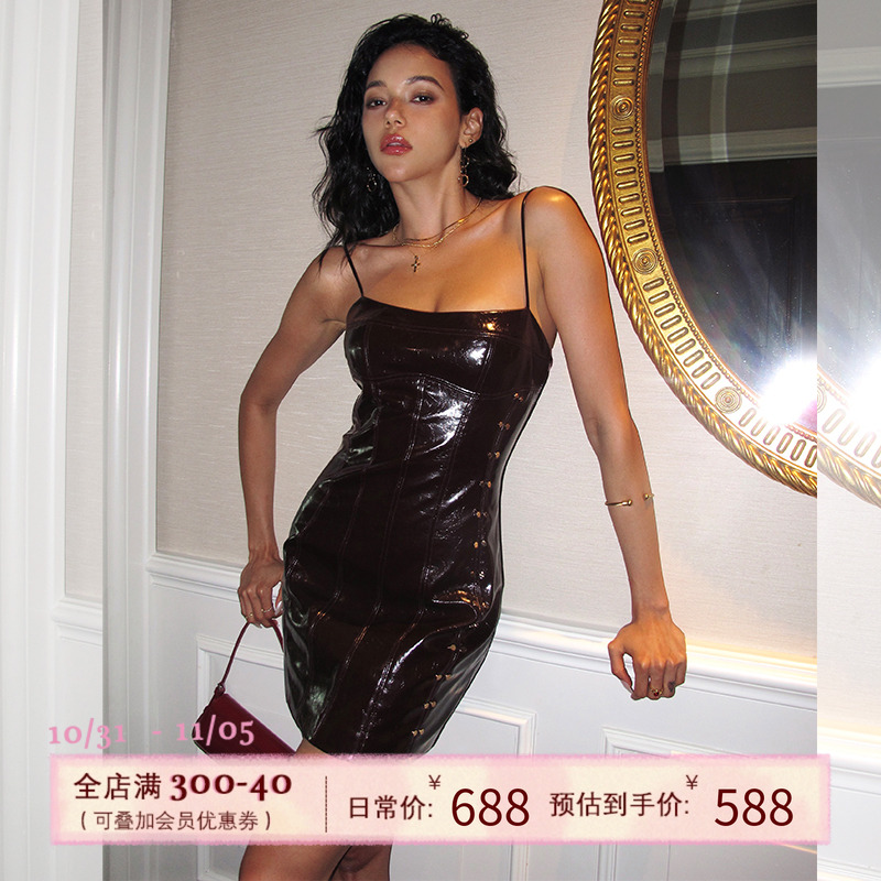ITSNIKAR欧美挂脖PU连衣裙女秋冬性感辣妹吊带皮裙美拉德包臀裙子