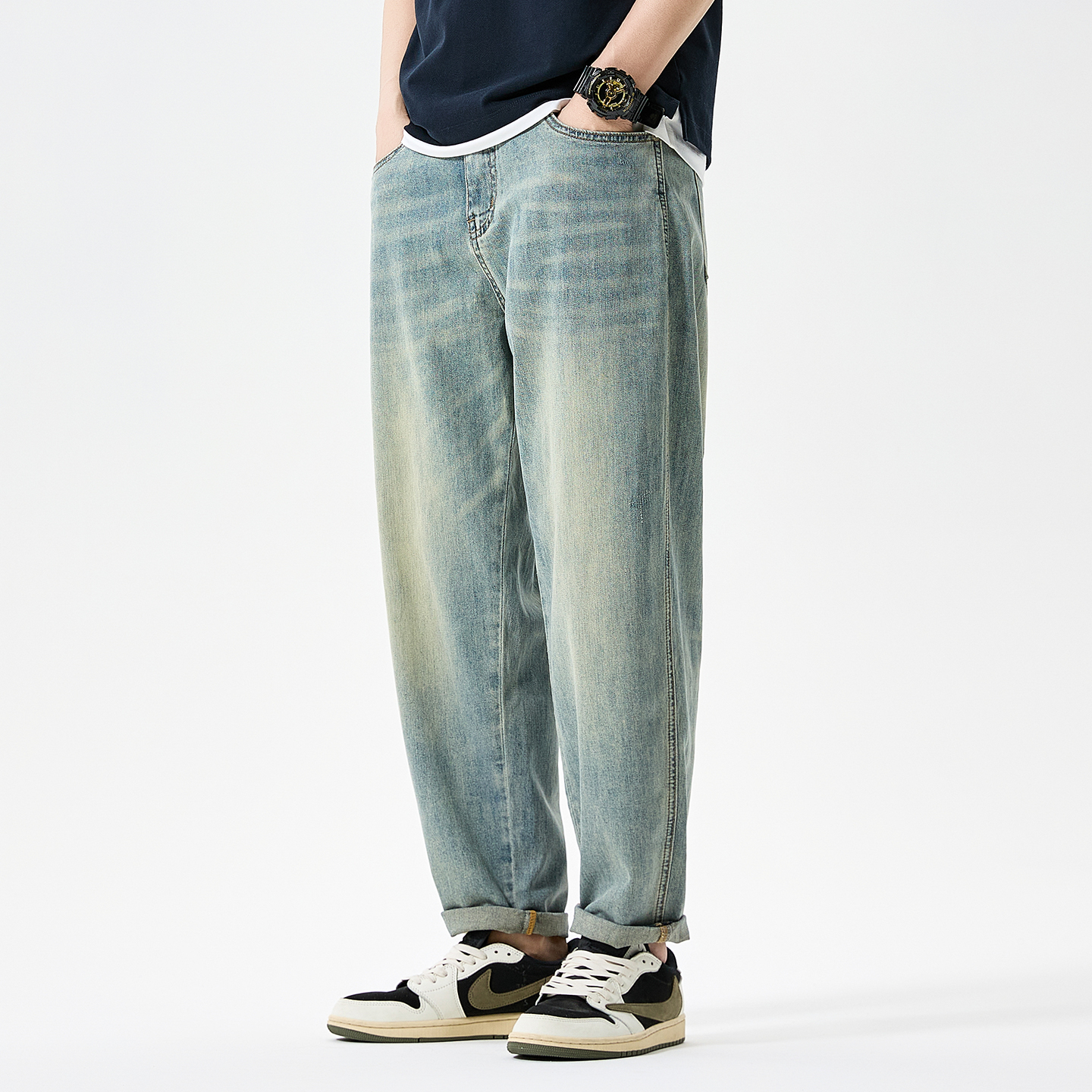 裤子男秋季牛仔裤男宽松直筒潮流百搭水洗美式高街黄泥染休闲长裤