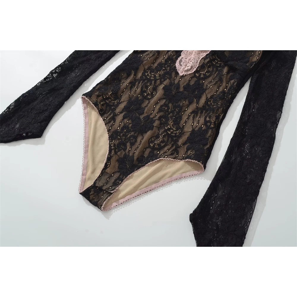 双层浮雕扭结蕾丝长袖连体衣女春秋设计感修身性感连裆打底衫上衣