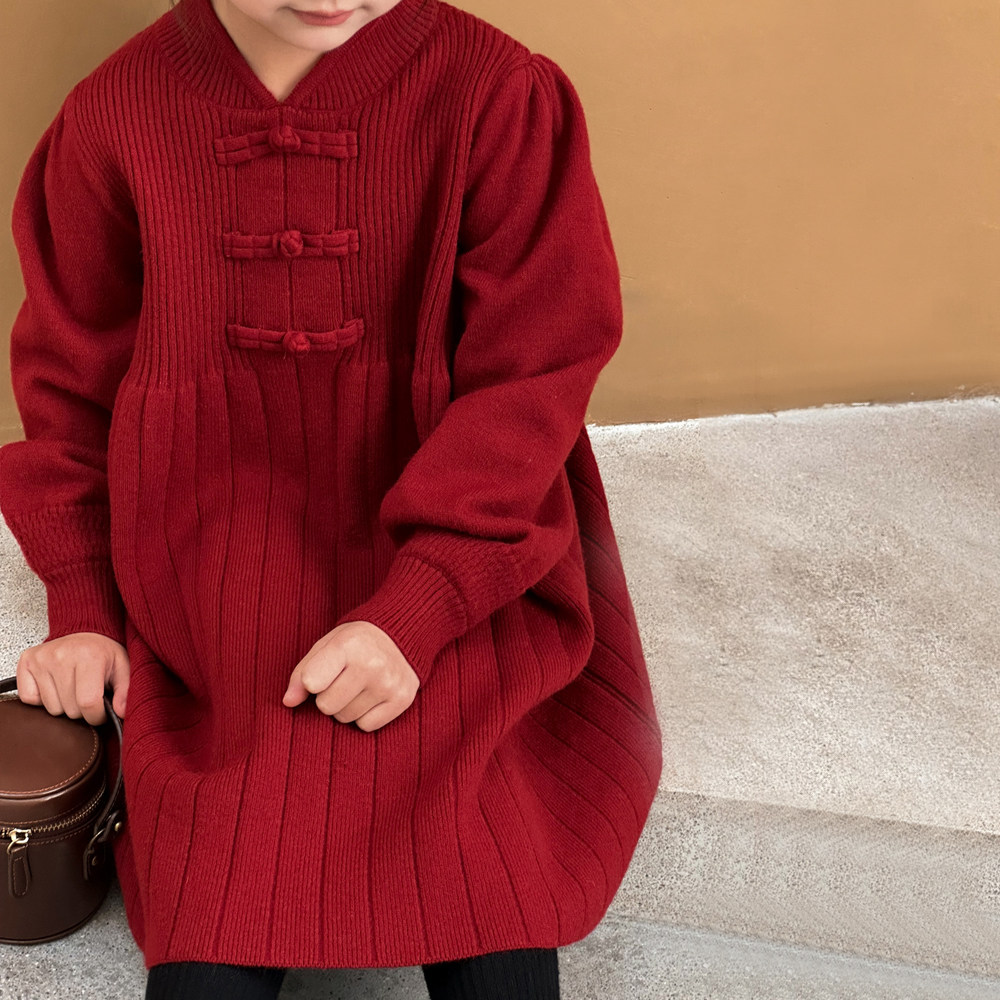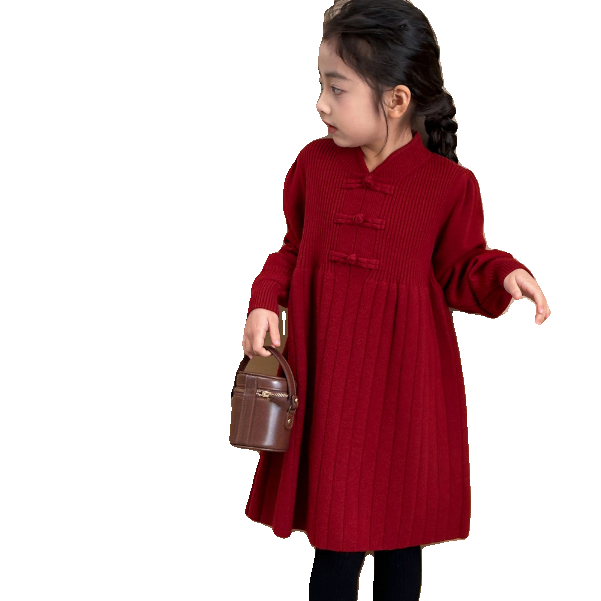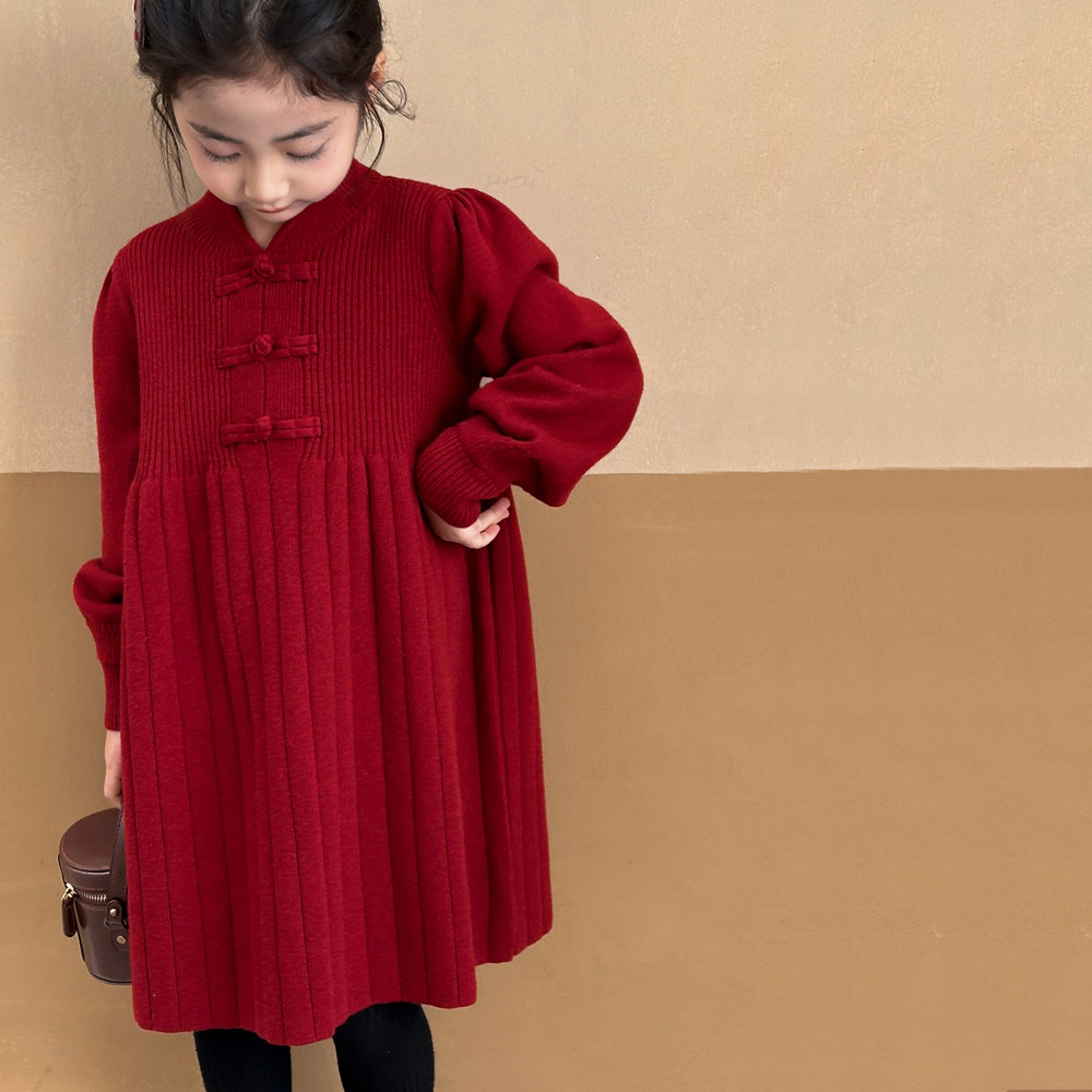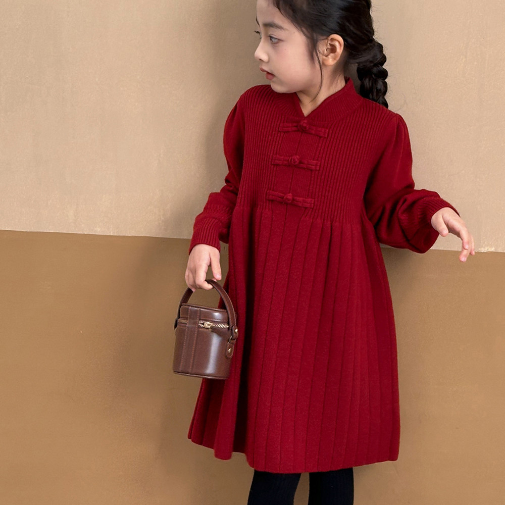 女童红色连衣裙儿童针织裙子新中式马年国潮新年衣服女大童拜年服