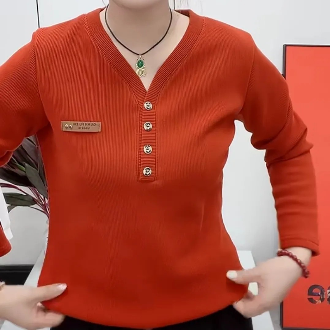 秋冬季长袖T恤时尚百搭弹力保暖上衣加绒V领打底衫妈妈装中年女装