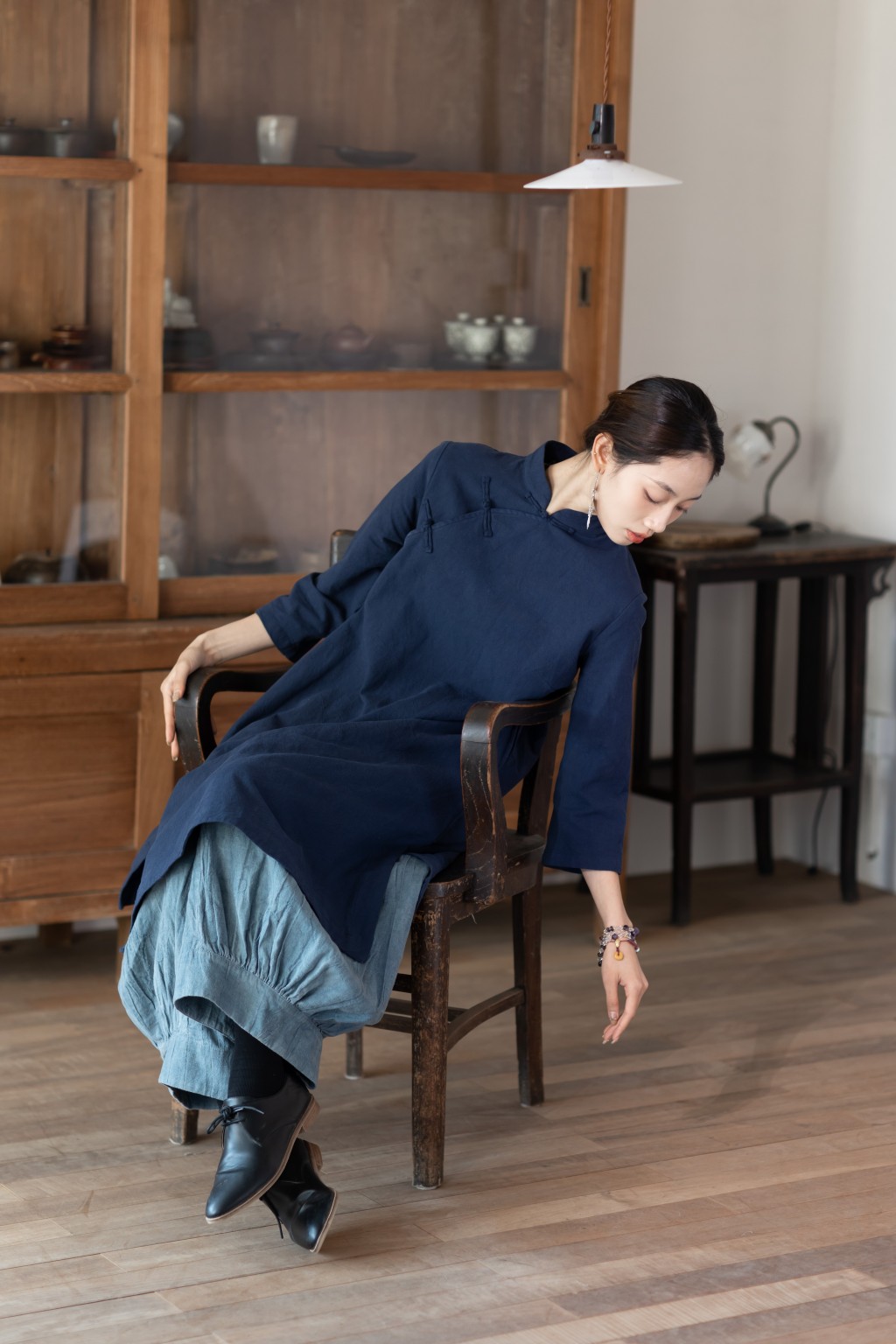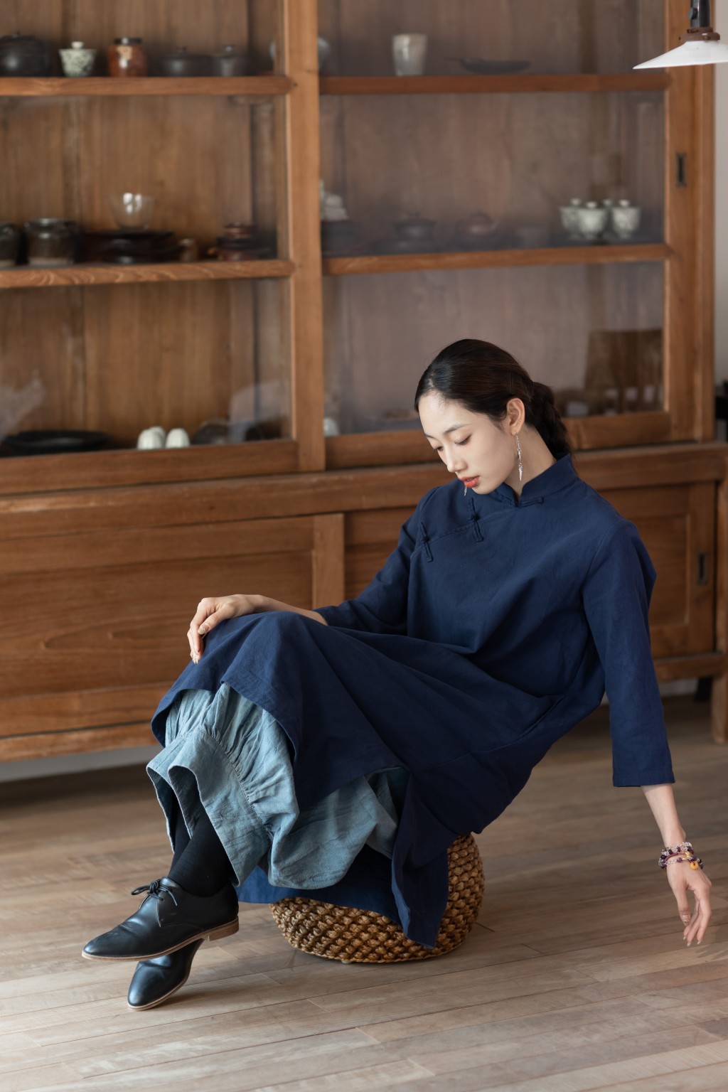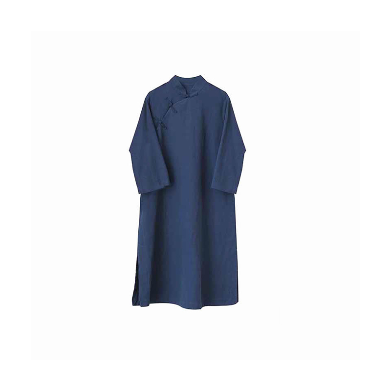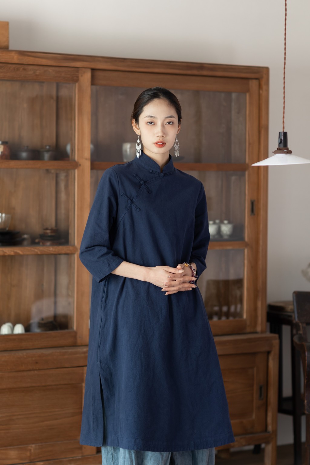 大拙新中式老钱风棉麻斜襟立领盘扣宽松款纯色七分袖连衣裙60109