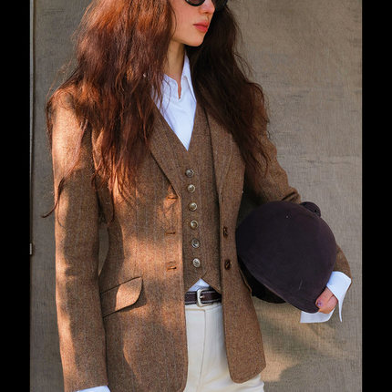 LISAYU复古羊毛西装马甲套装老钱人字呢花呢背心紧身长裤三件套装