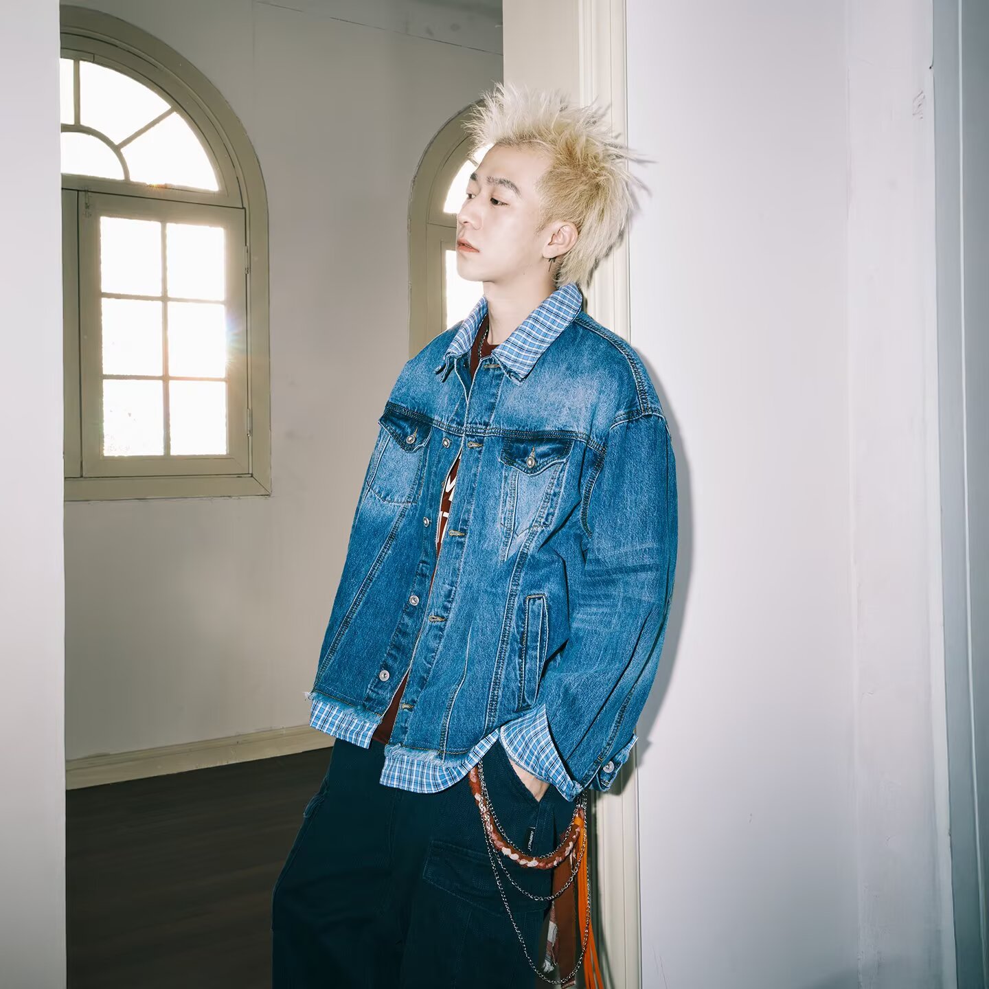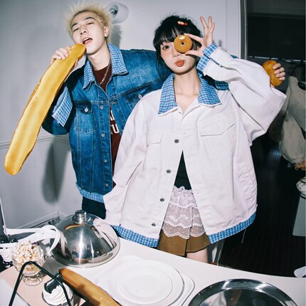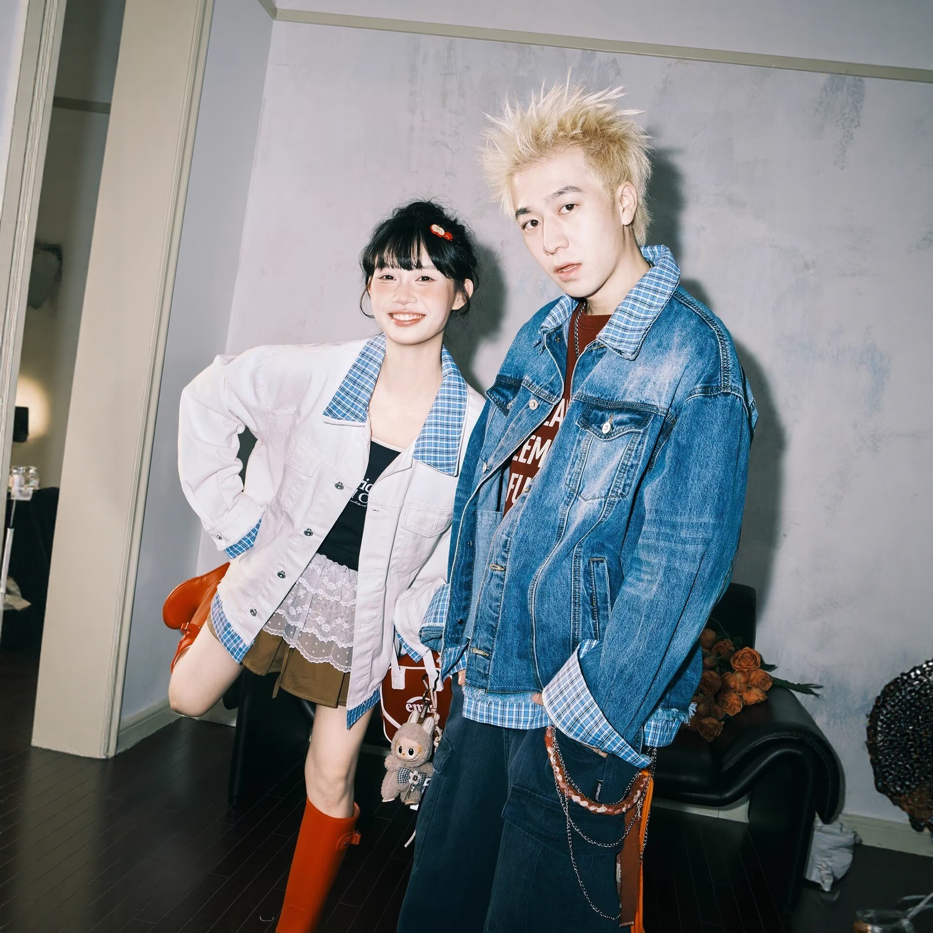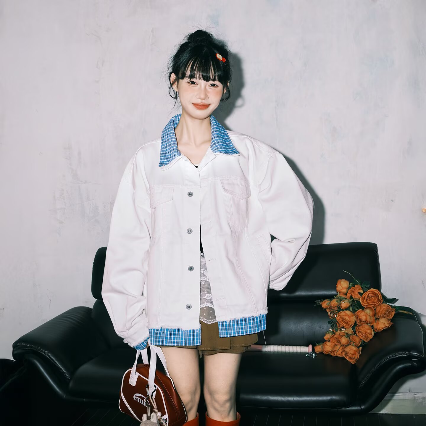 格纹拼接假两件牛仔外套男女潮牌街头设计感水洗复古夹克