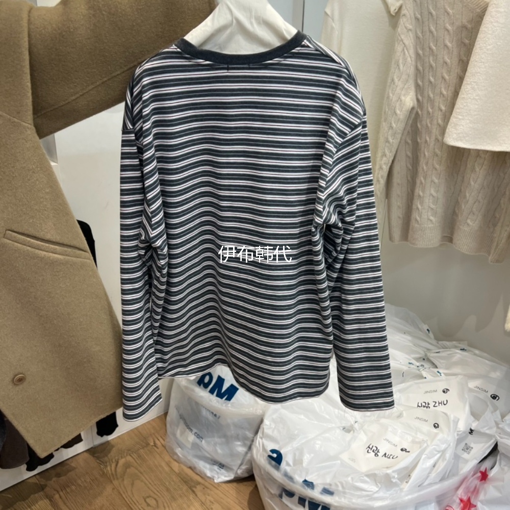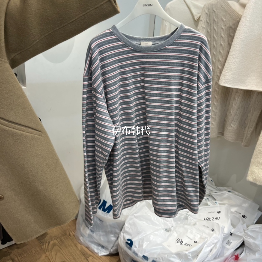 JINSIM韩国东大门正品代购25冬款 圆领休闲棉质宽松条纹长袖T恤