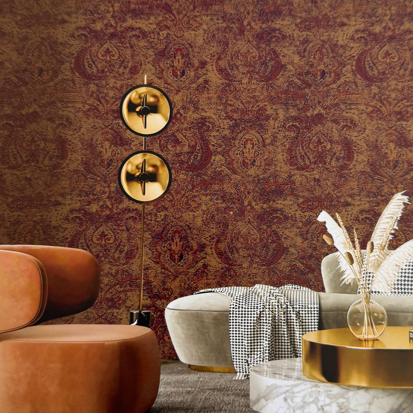 美式复古红色腰果花墙布客厅卧室背景墙满铺红色柔然高端无缝壁布