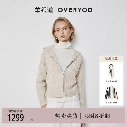 羊织道球兰 双拉链绞花连帽针织女士春季开衫秋绵羊毛毛衣外套
