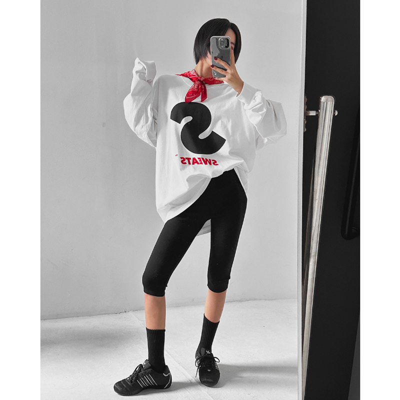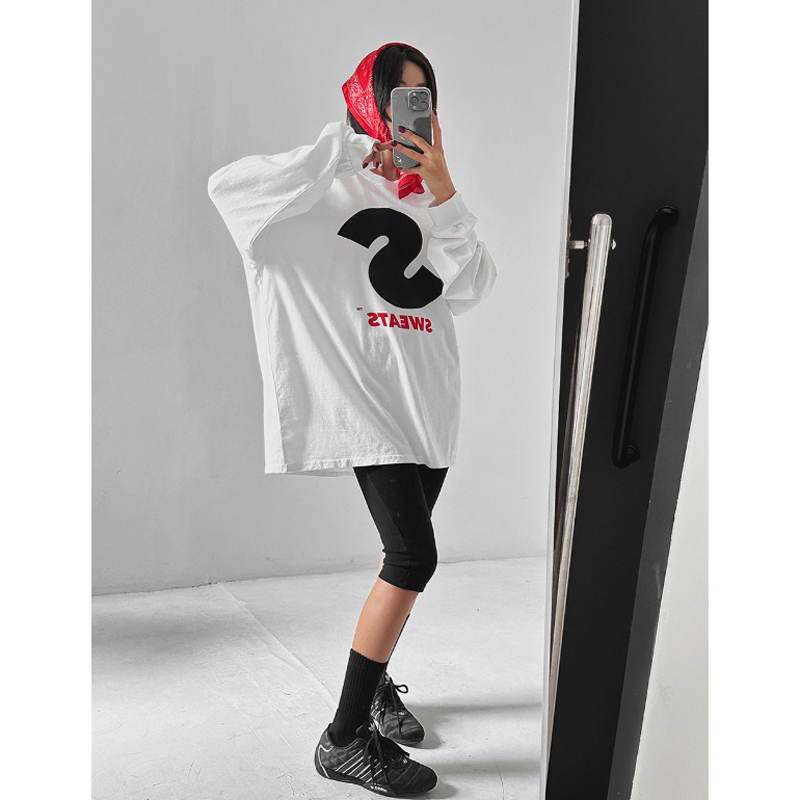 韩国字母印花长袖圆领中长款T恤