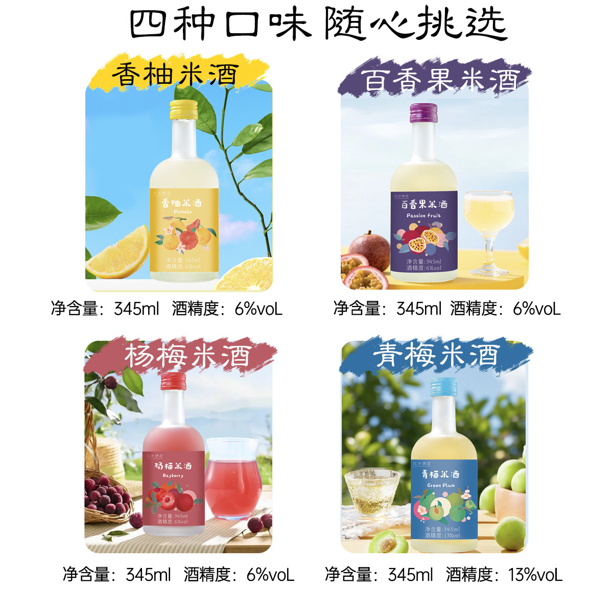 花米贤庄新品香柚百香果青梅杨梅果汁发酵微醺果酒345ml/瓶