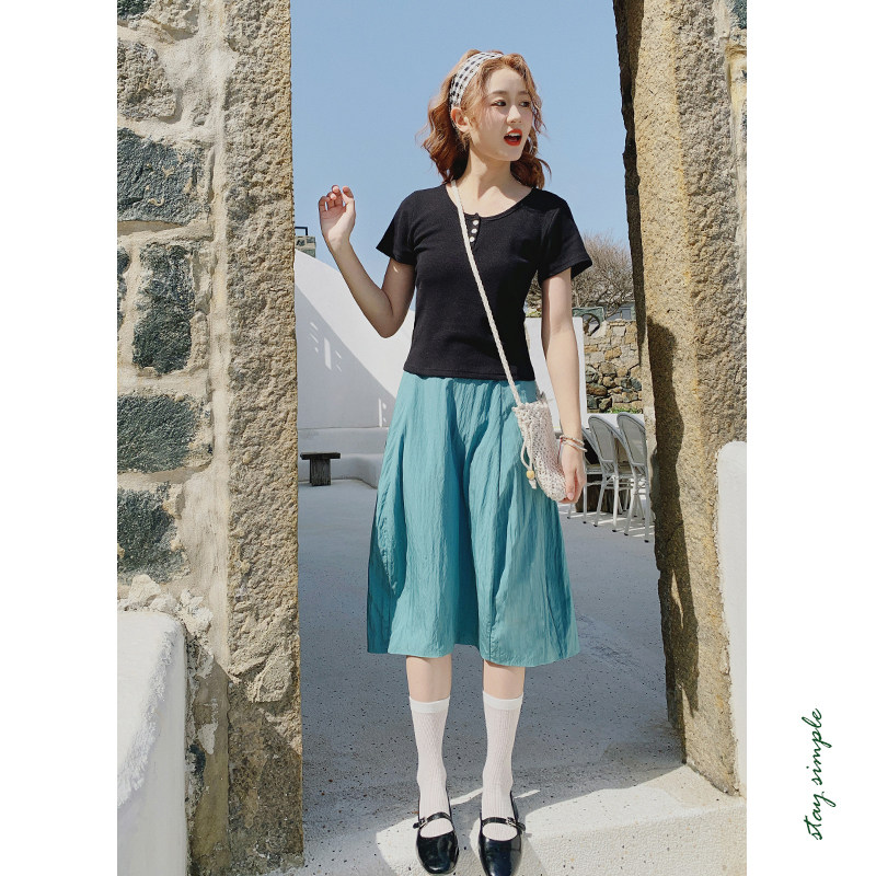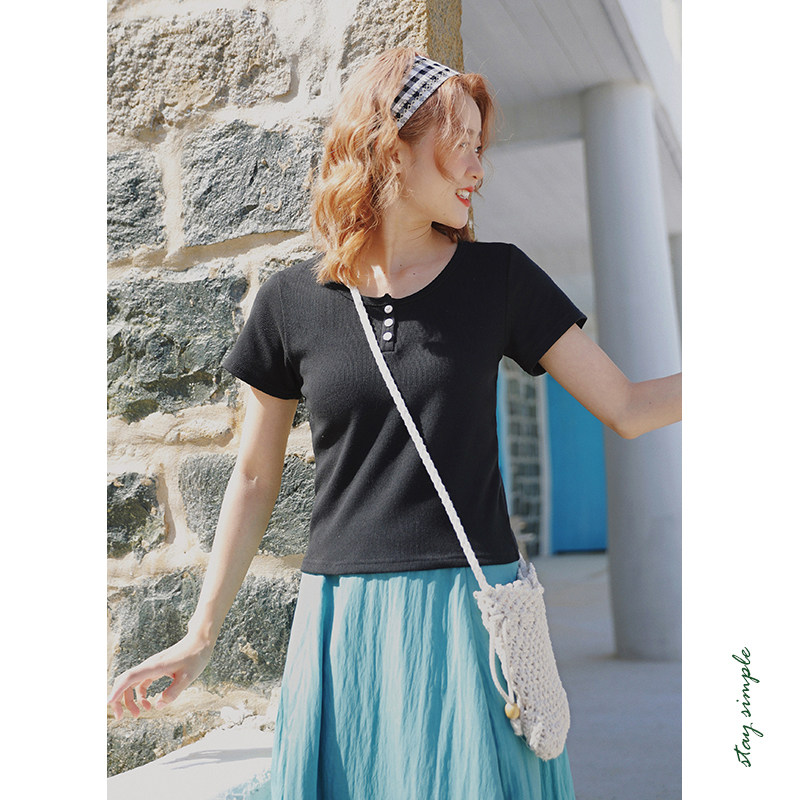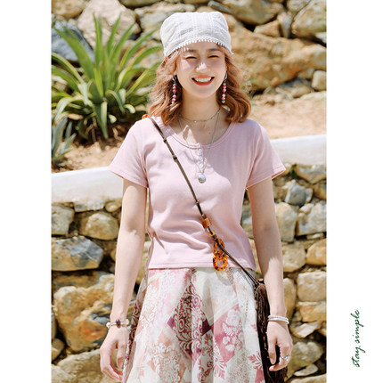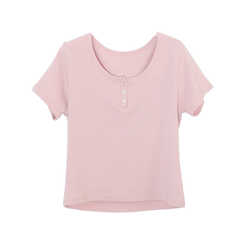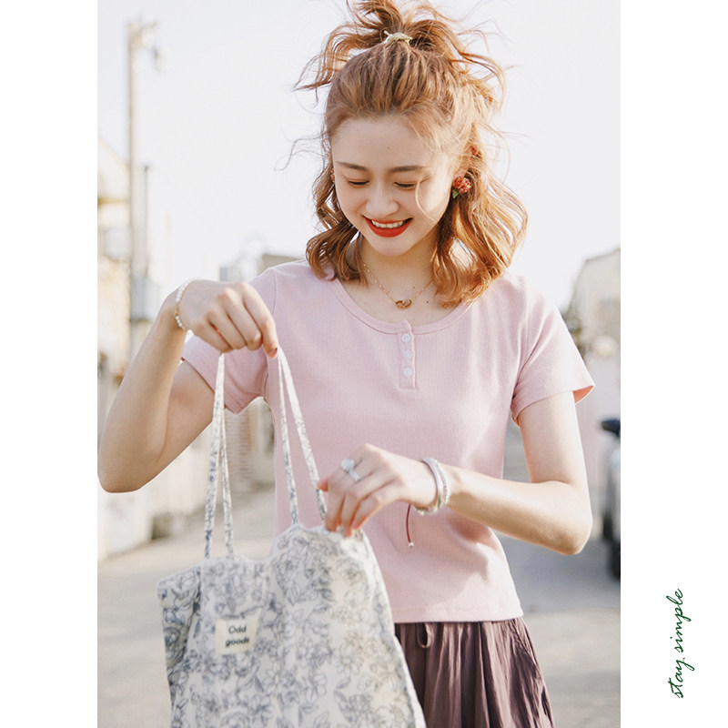 花吉B954粉色三粒扣修身弹力圆领T恤女2025新款夏宽松短袖上衣