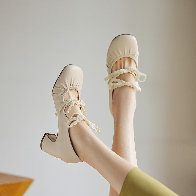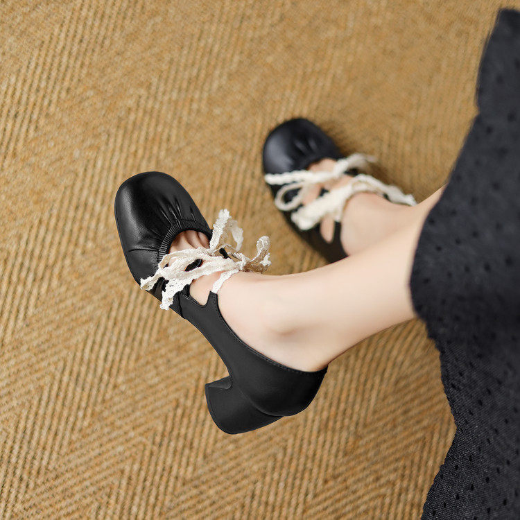 2026春法式软面玛丽珍女鞋黑色系带浅口圆头粗跟舒适牛皮单鞋