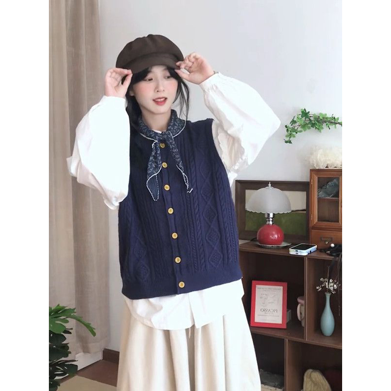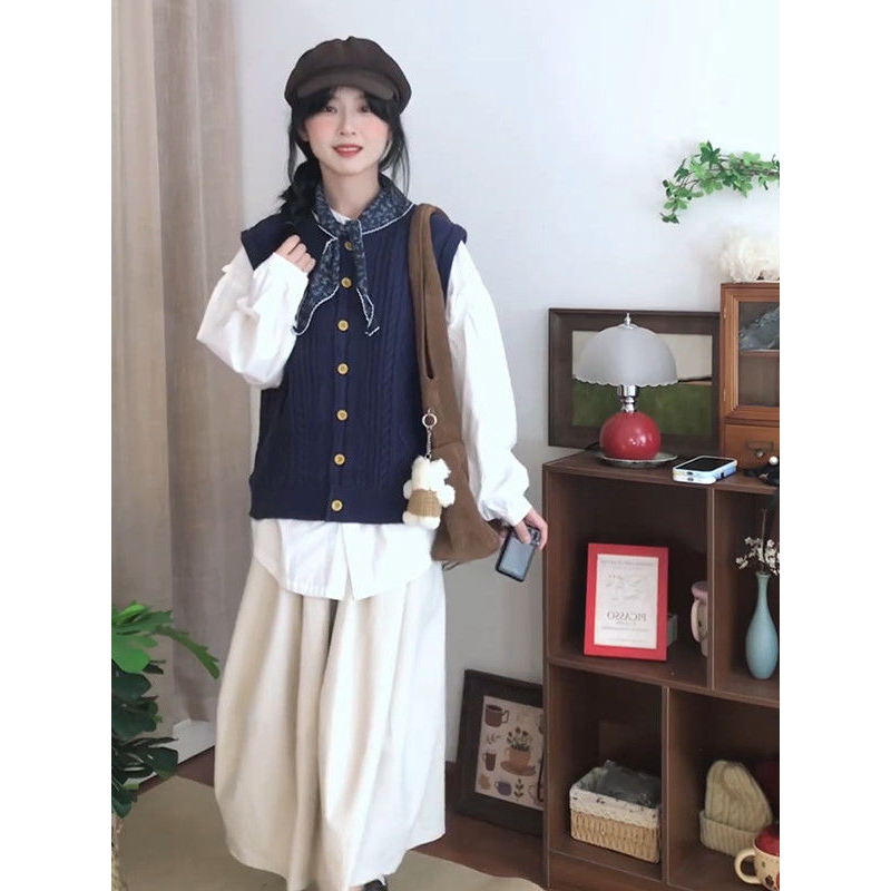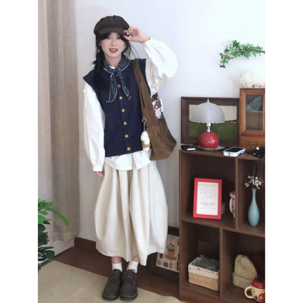 法式气质复古藏青马甲开衫+白色衬衫+高腰半身裙秋季新款三件套装