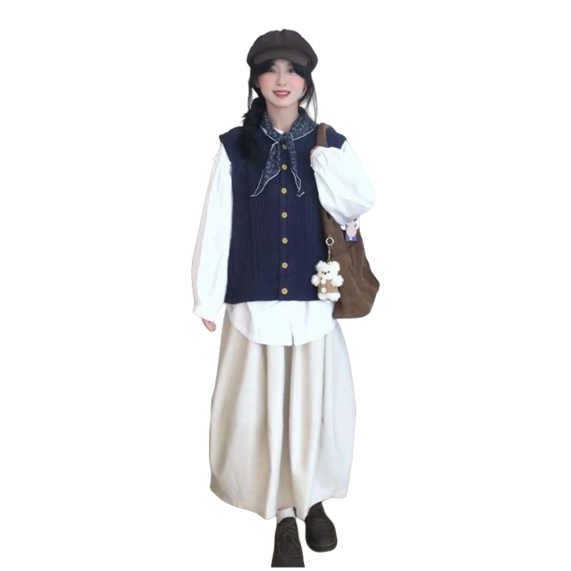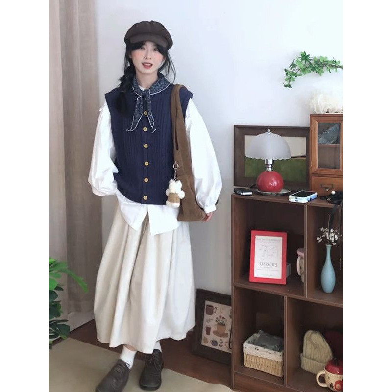 藏青马甲开衫+白色衬衫+半身裙