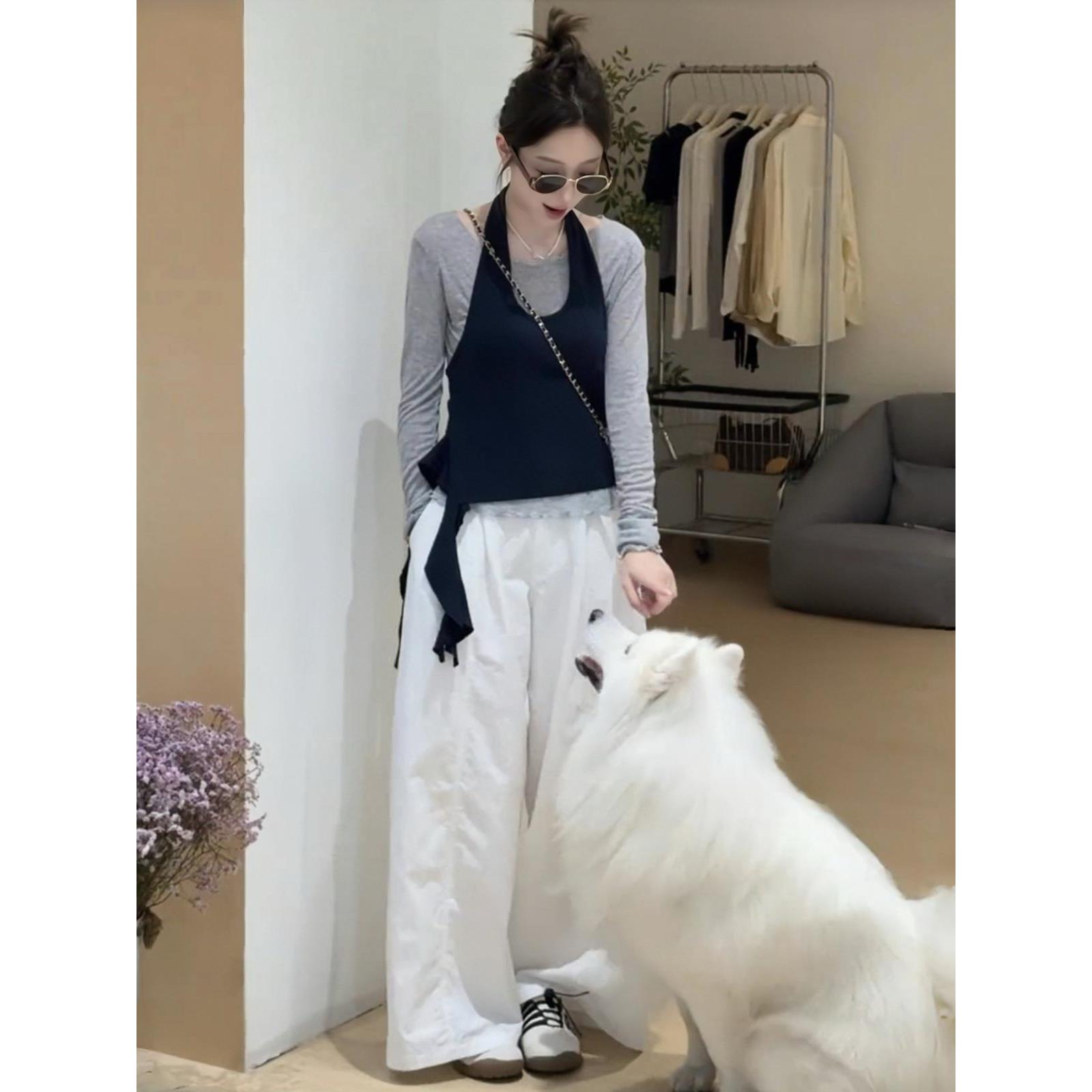2025超火穿搭一整套秋装韩系时尚减龄挂脖背心长袖T恤阔腿裤套装