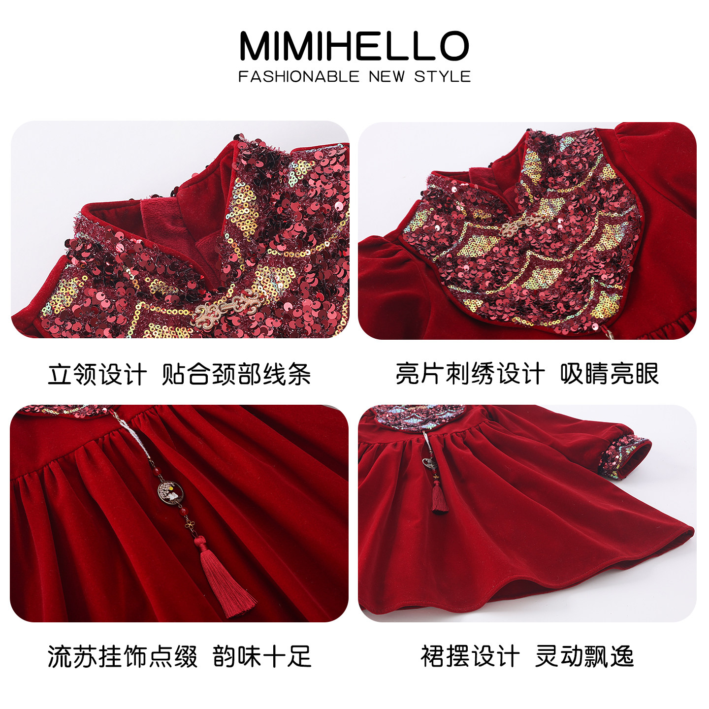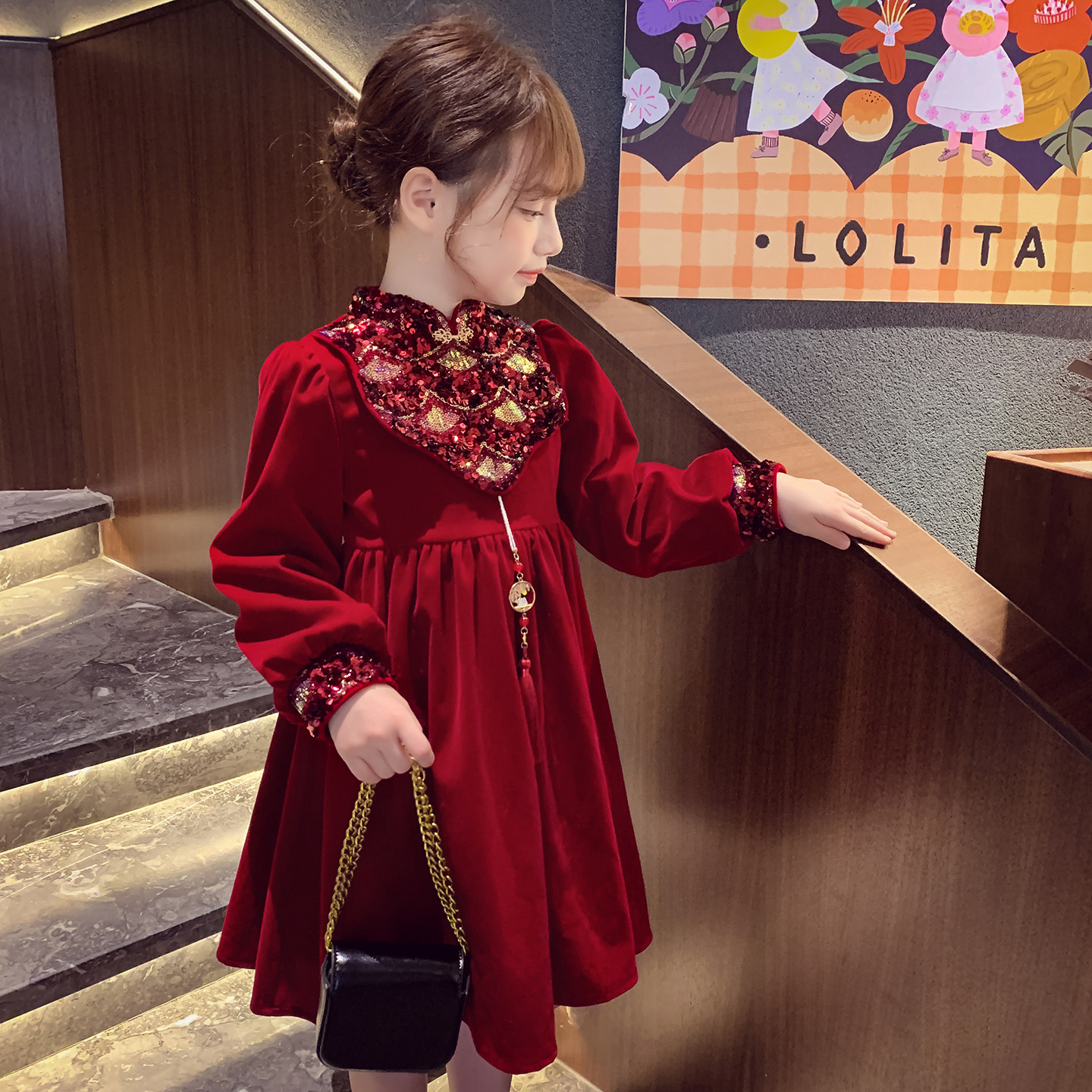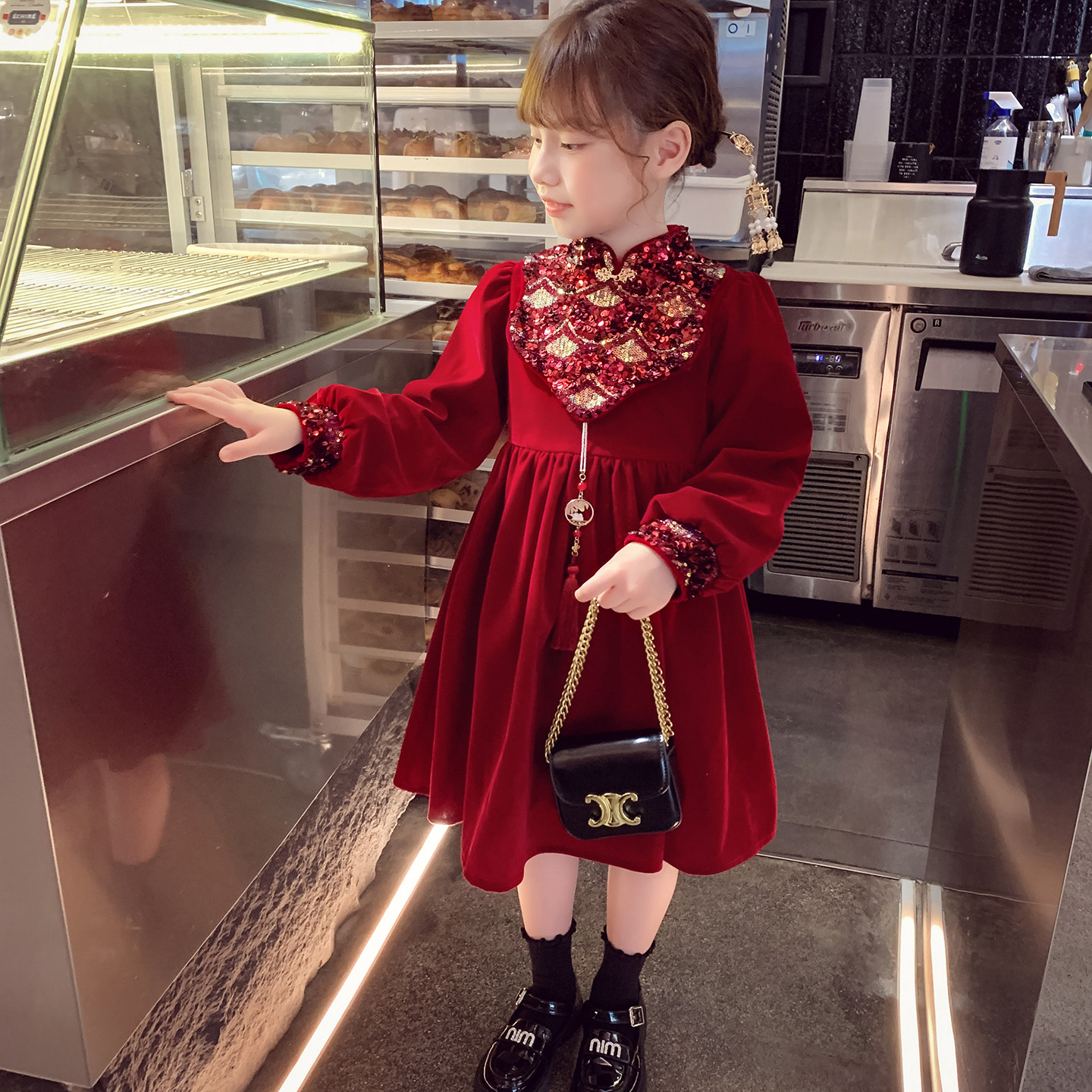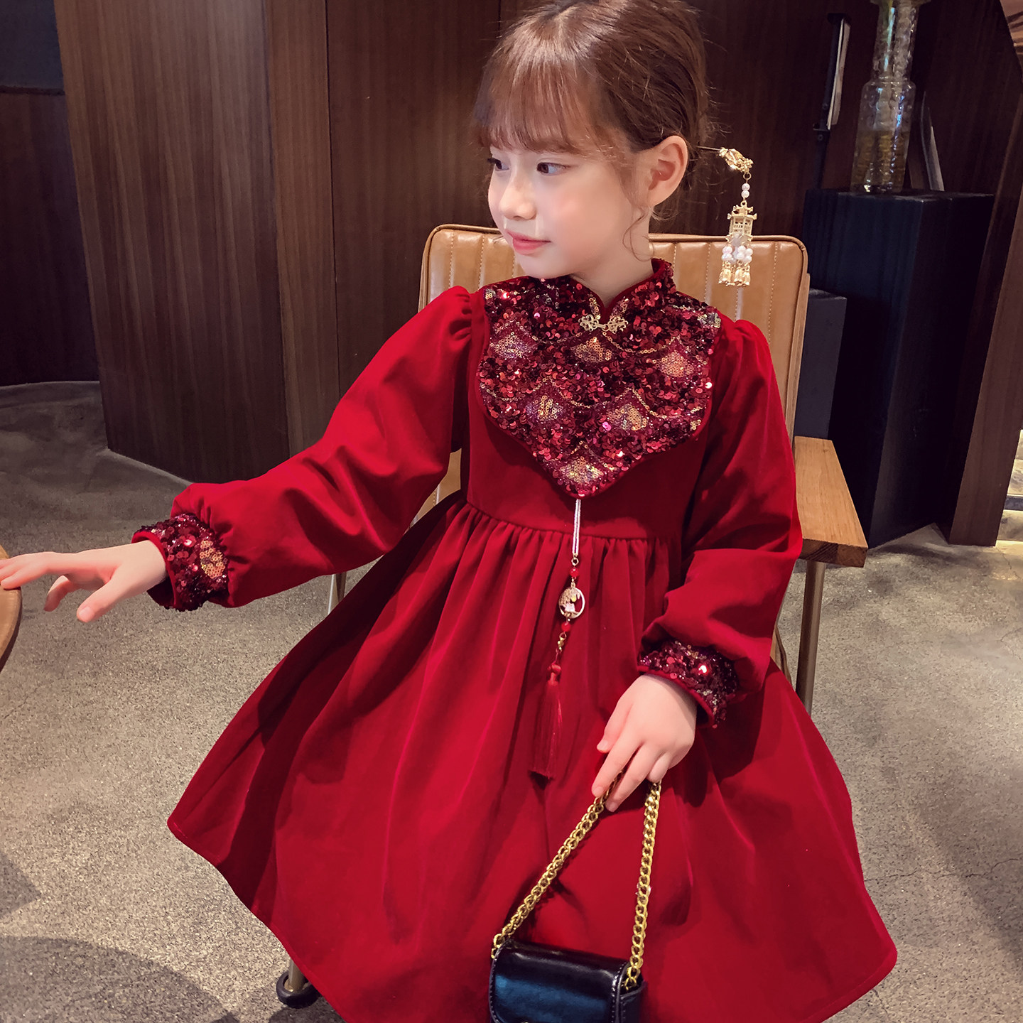 女童新年红色连衣裙秋冬季2025新款洋气儿童加绒公主裙国风拜年服
