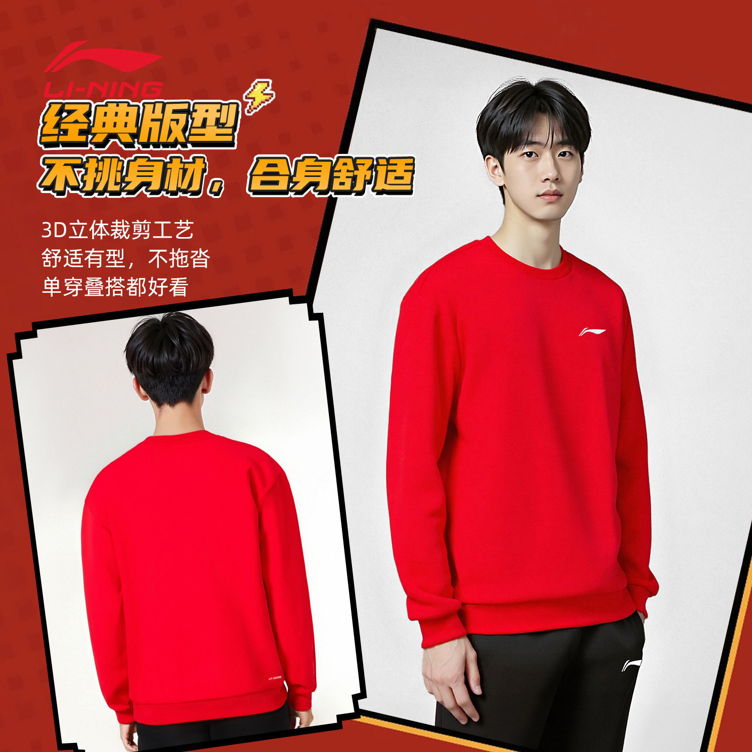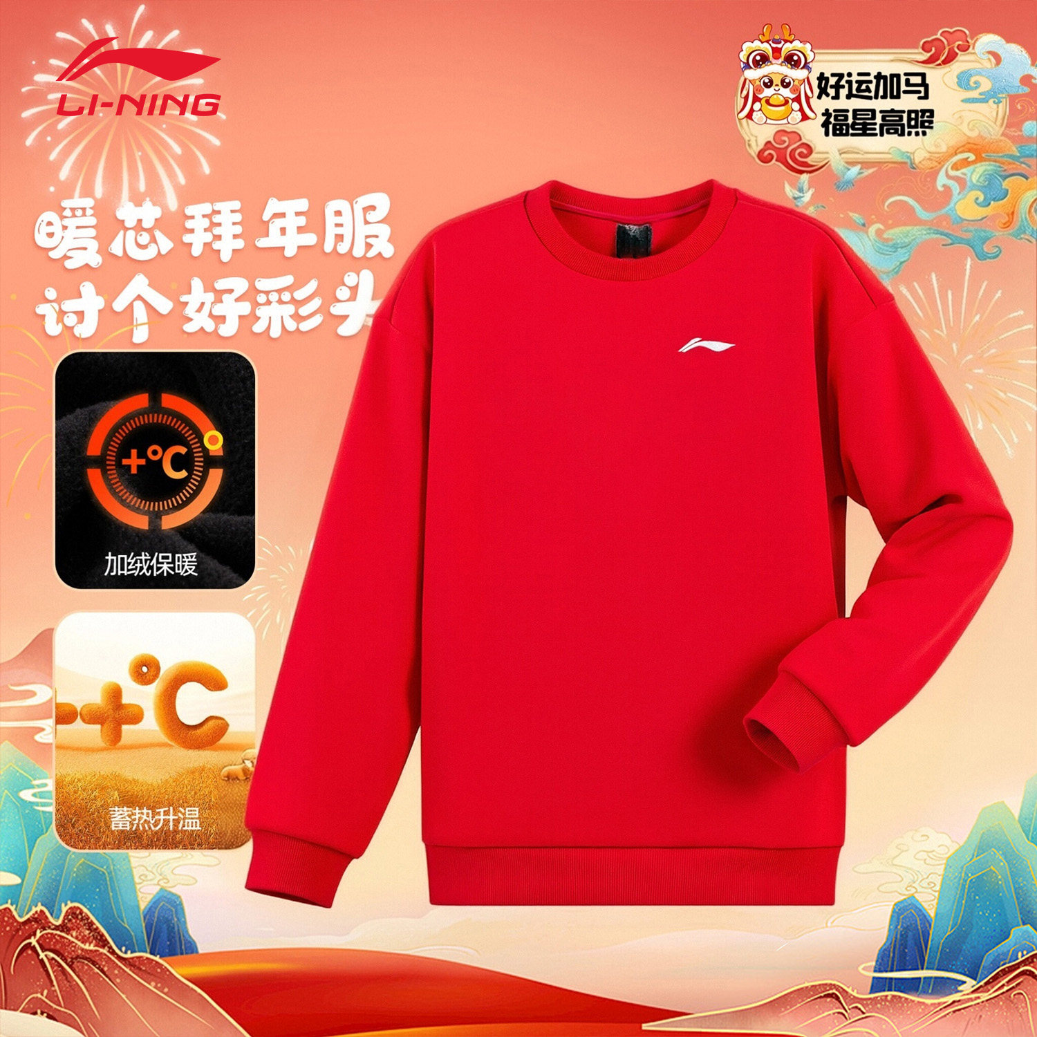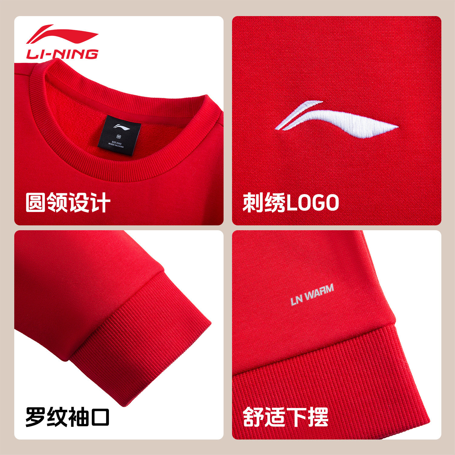 李宁红色加绒卫衣男本命年秋冬休闲宽松圆领保暖舒适套头运动上衣