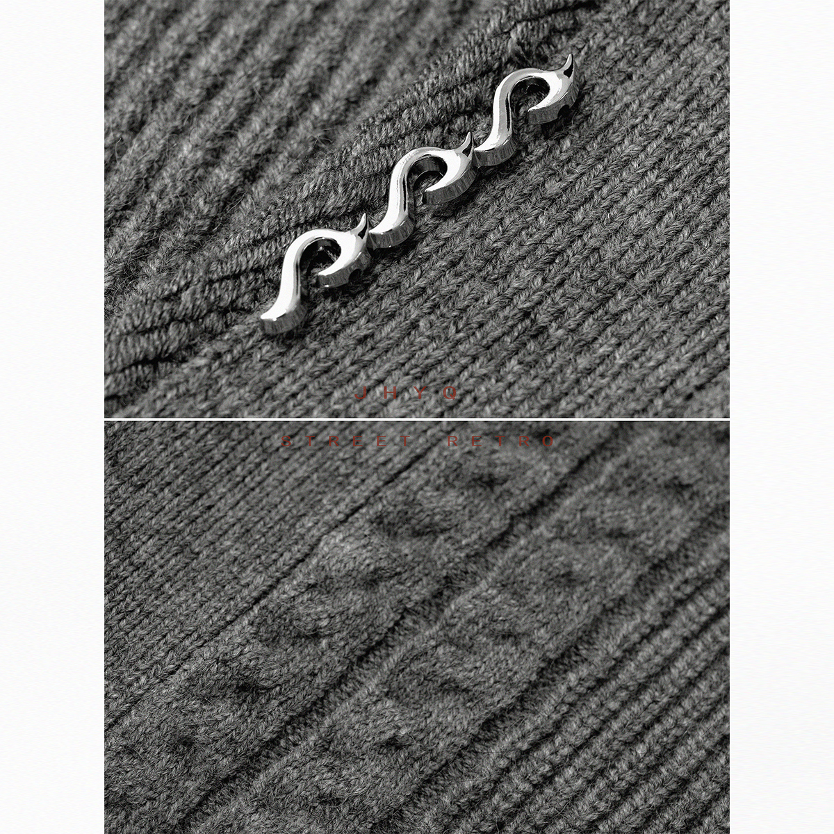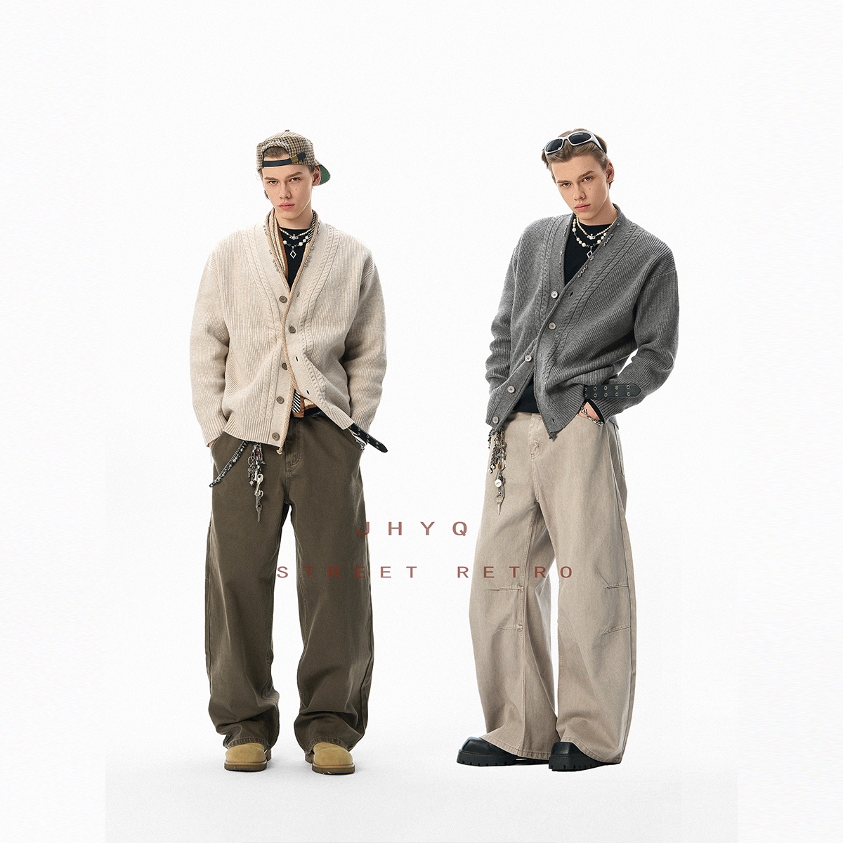 JHYQ美式复古绞花拼编绳银钩金属老钱V领针织开衫男秋冬休闲外套