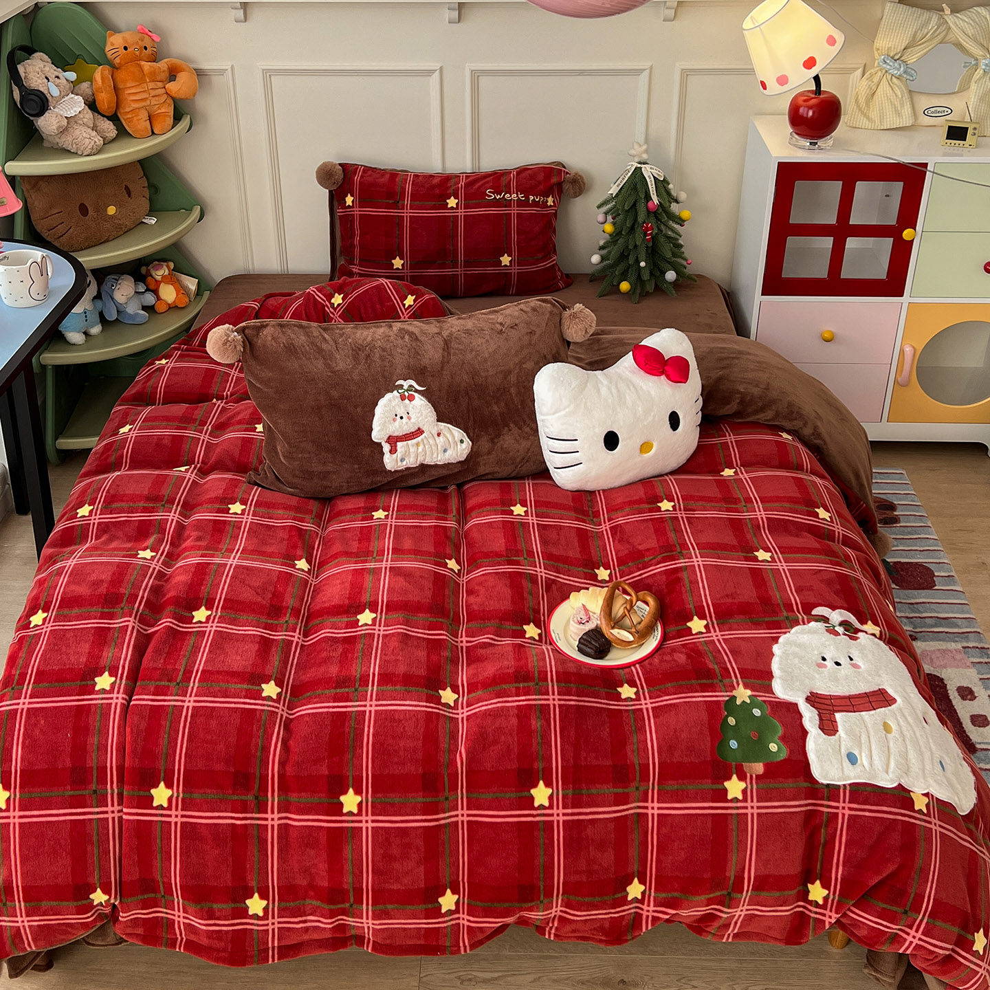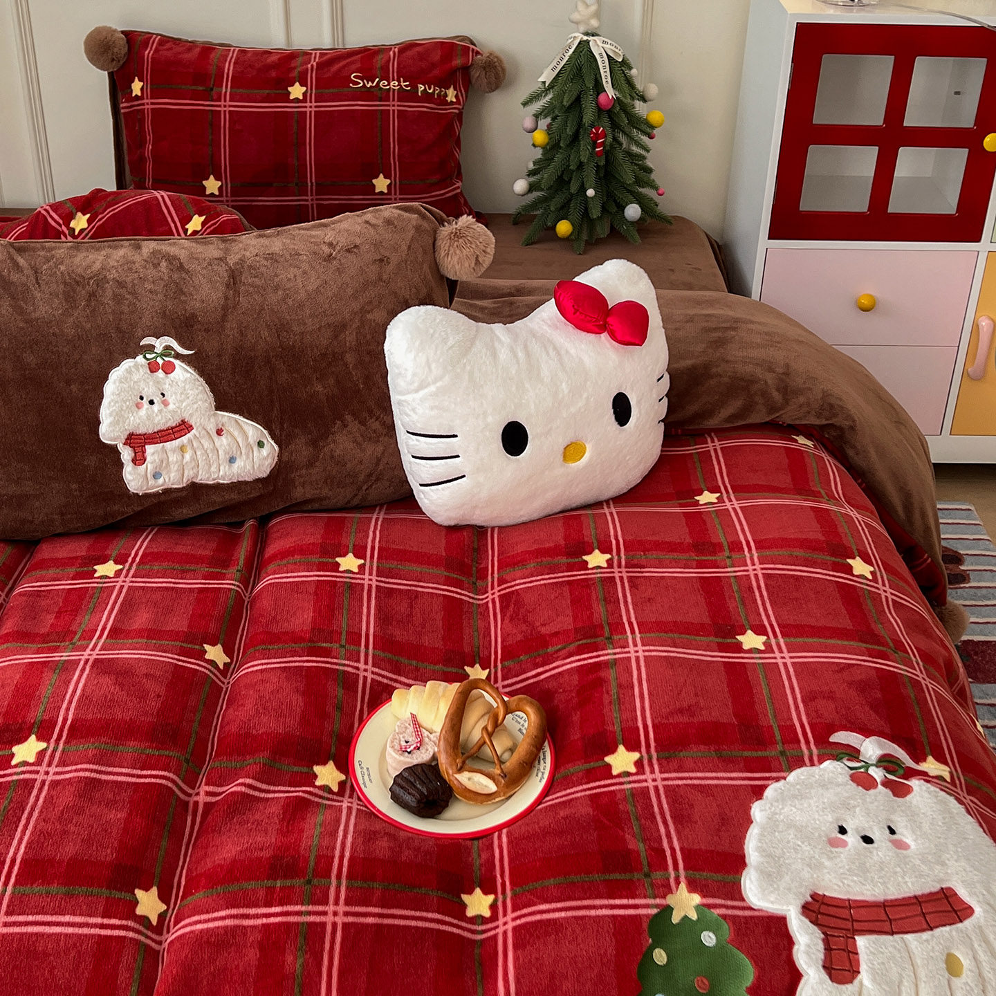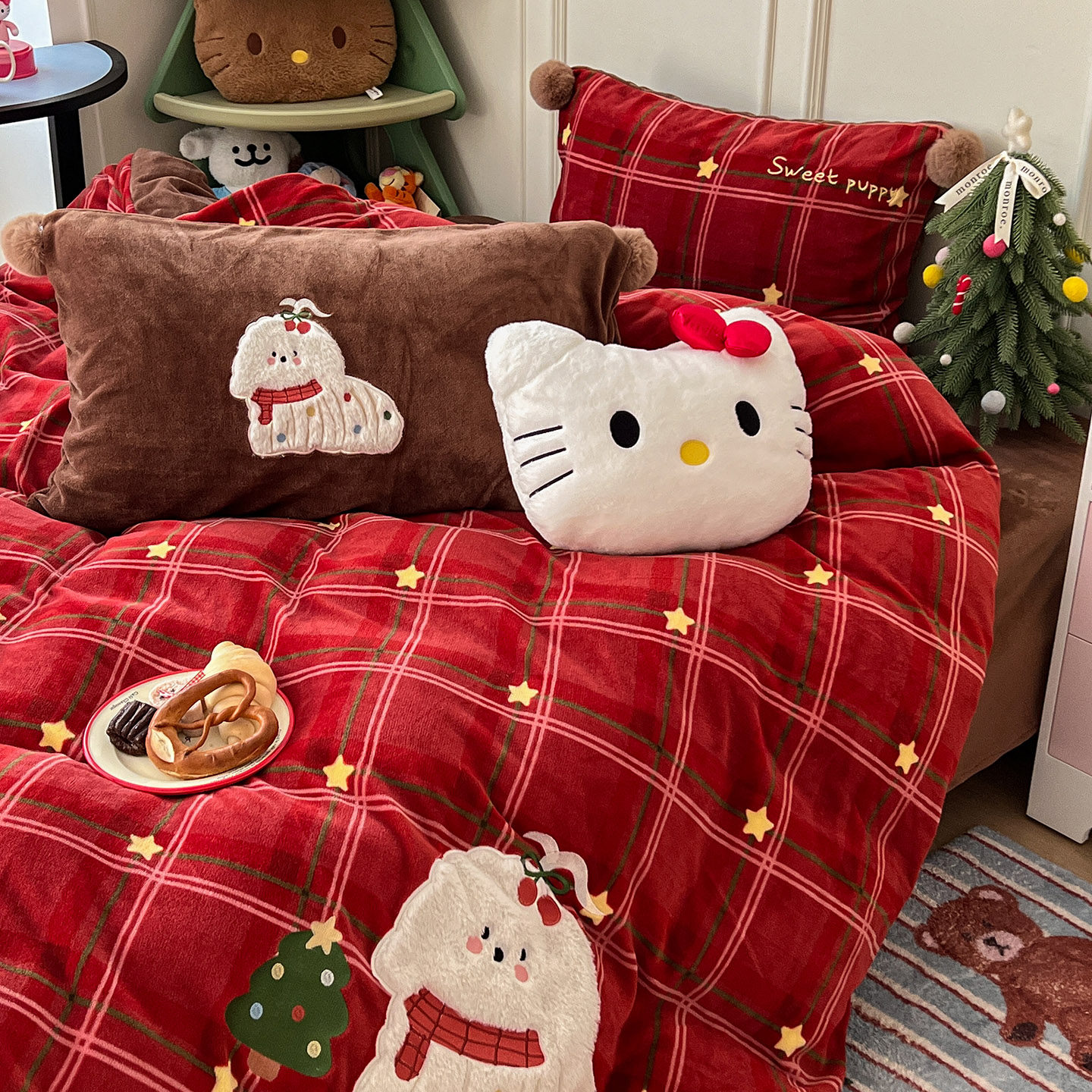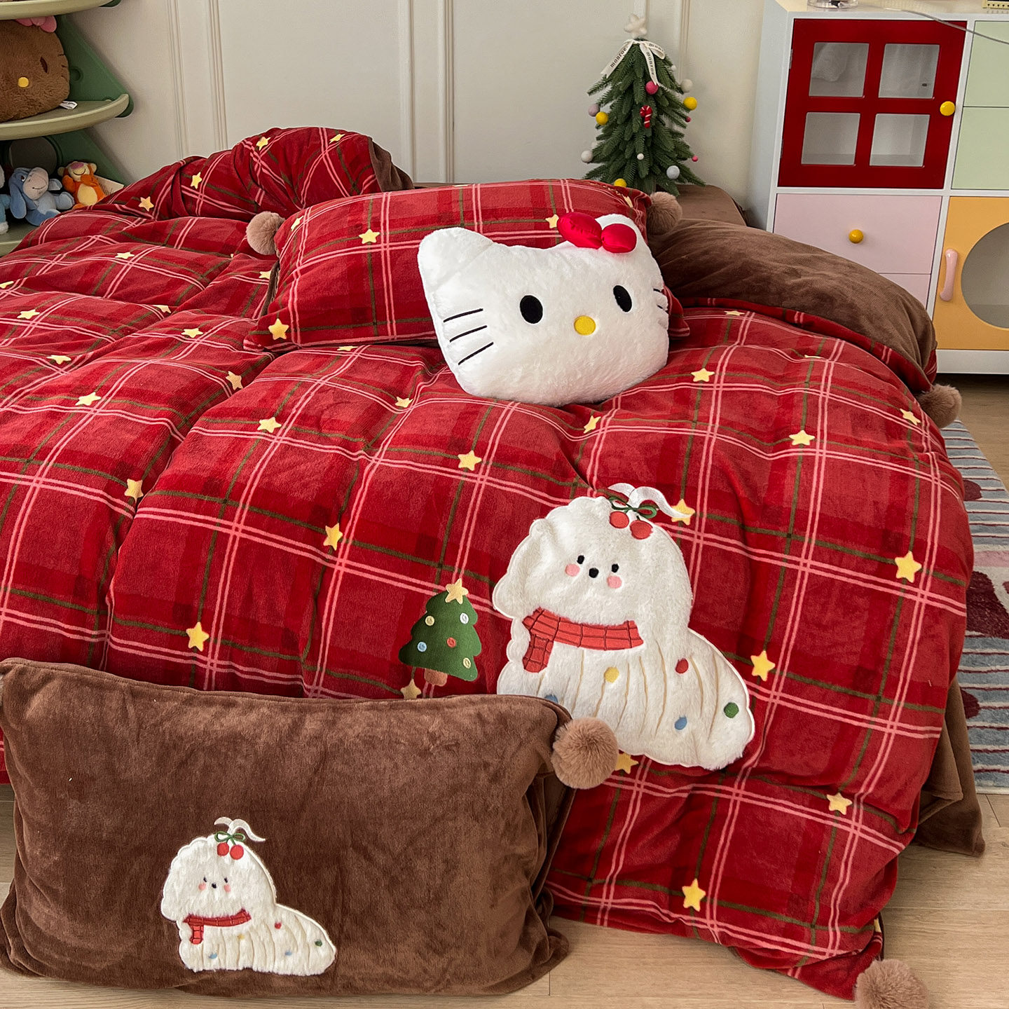 月光巴士圣诞红刺绣牛奶绒加厚床上四件套球球被套加绒床单珊瑚绒