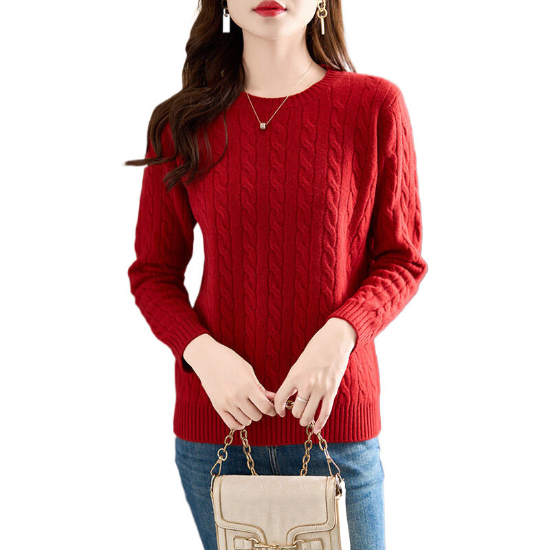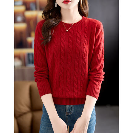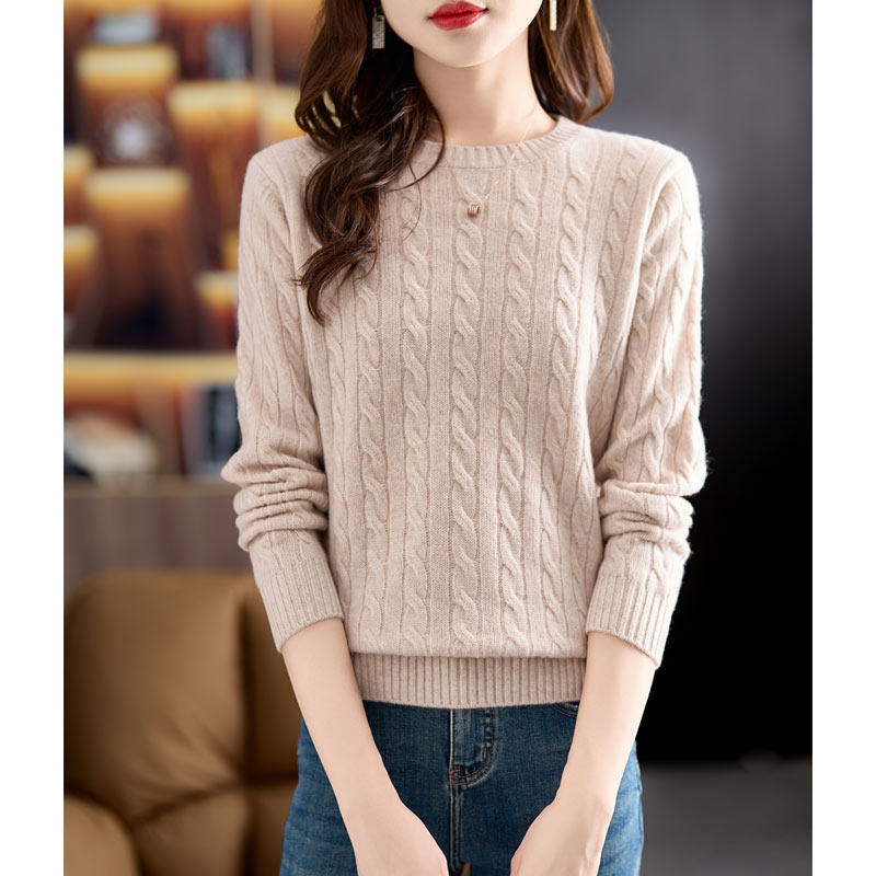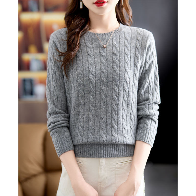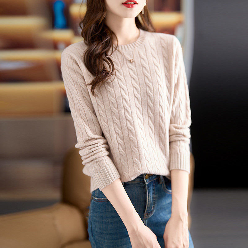 圆领麻花100%羊毛衫女秋冬打底衫