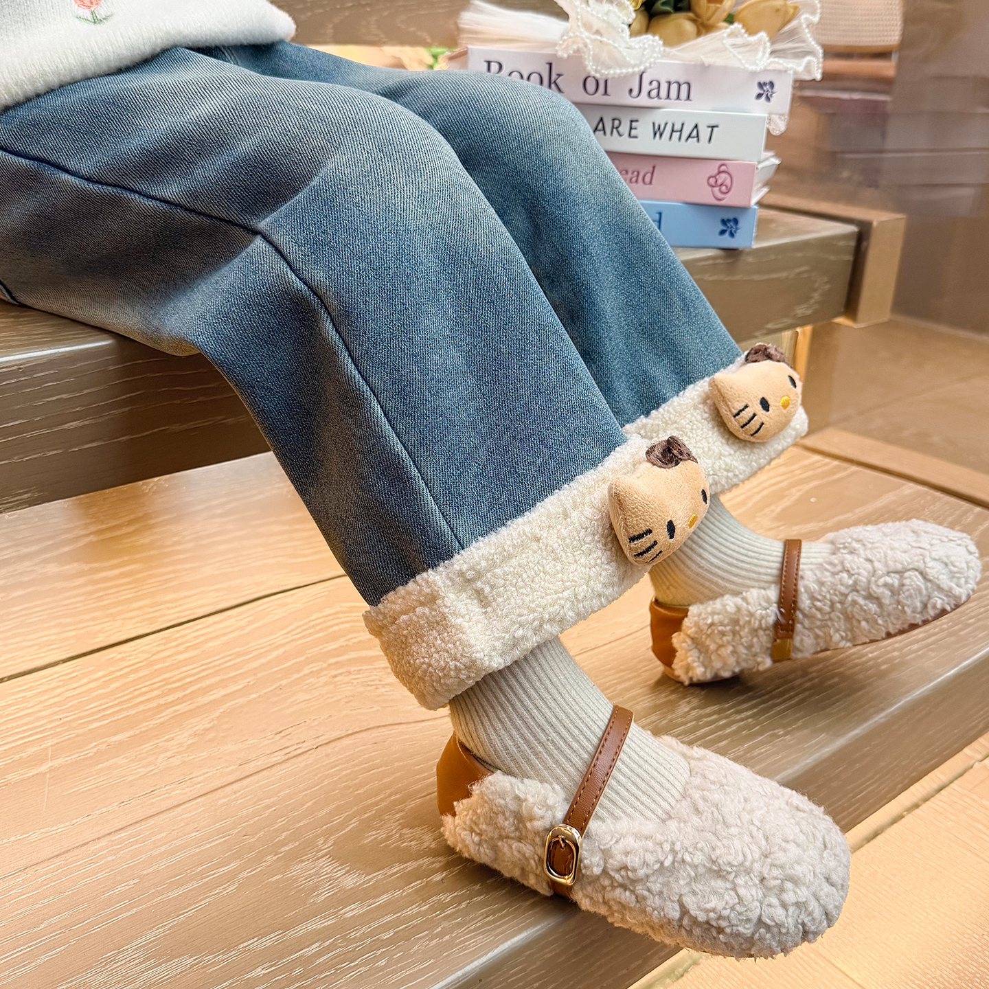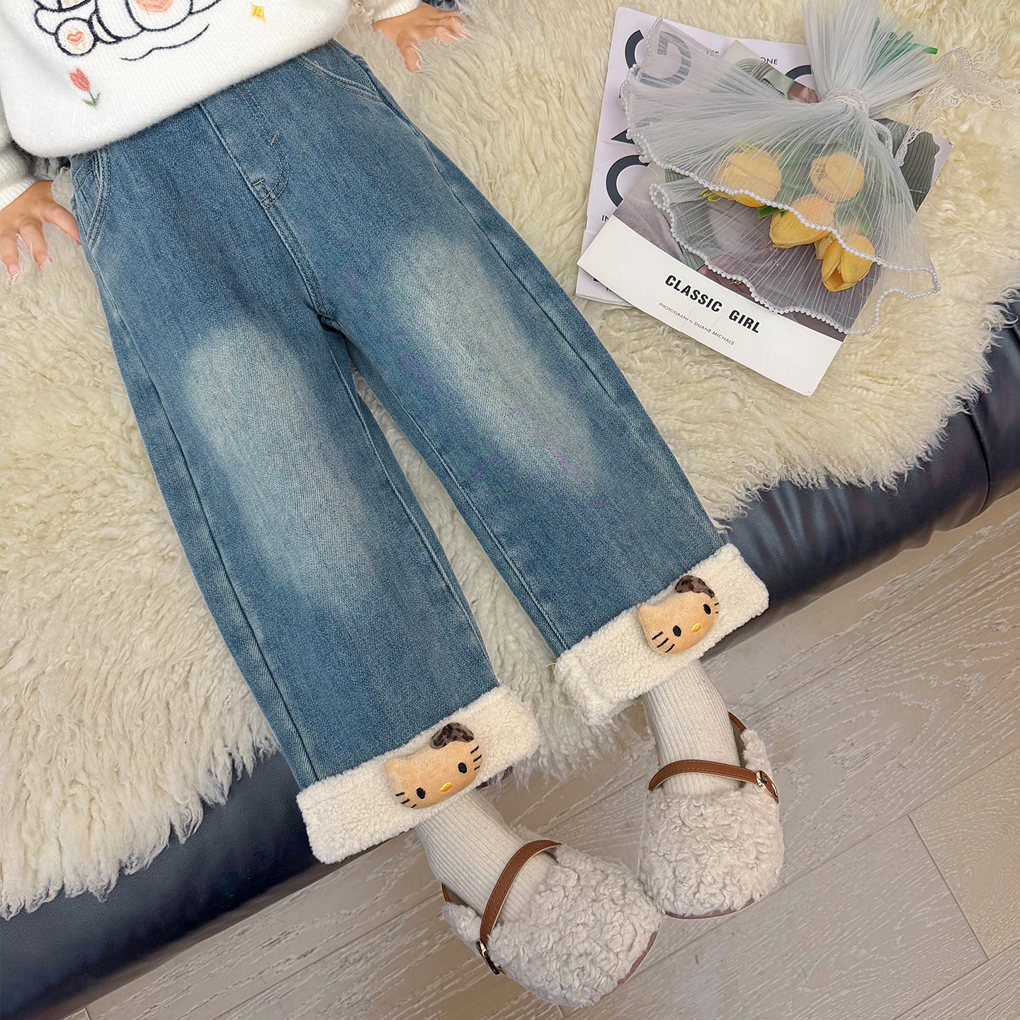 女童加绒牛仔裤2025新款女宝宝冬装直筒裤猫咪儿童裤子加厚一体绒