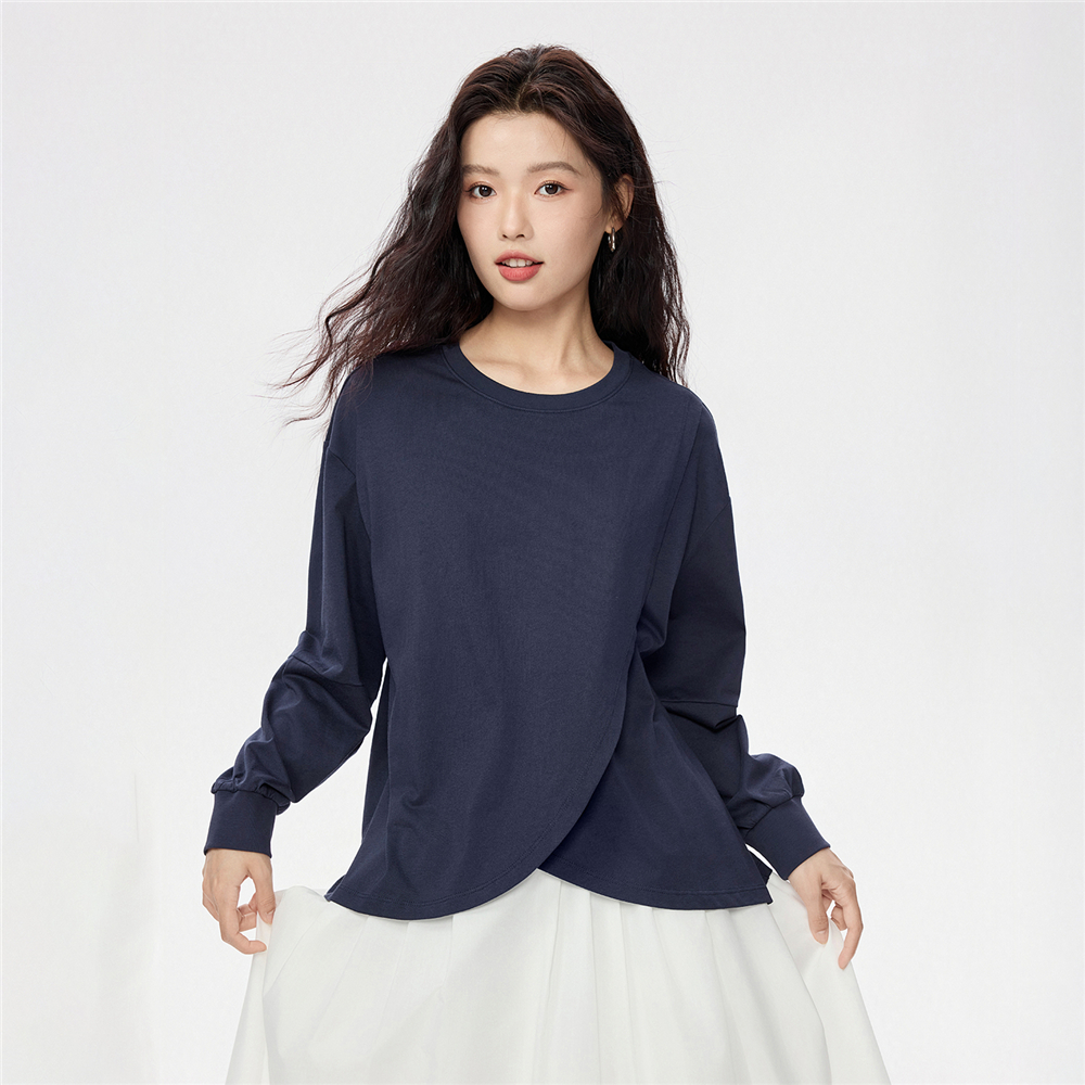 佐丹奴长袖T恤女秋季新款纯棉纯色弧形搭片宽松圆领上衣13325787
