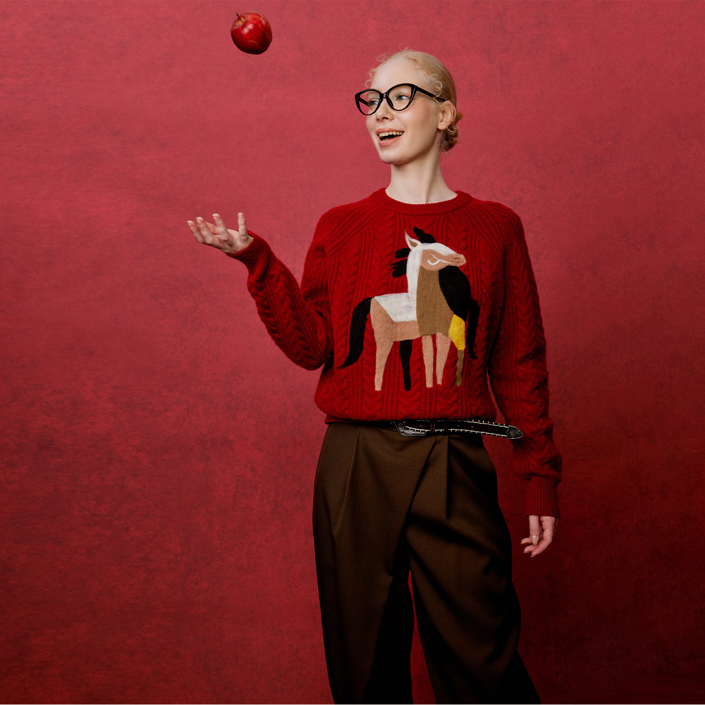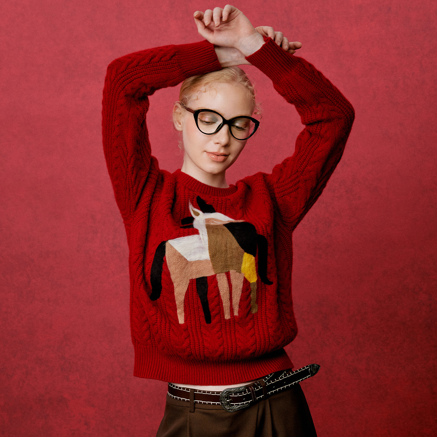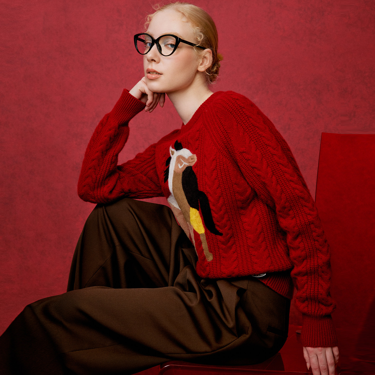 艺之卉刺绣马年开运绞花套头miu系针织毛衣赭石红毛衫2025冬新款