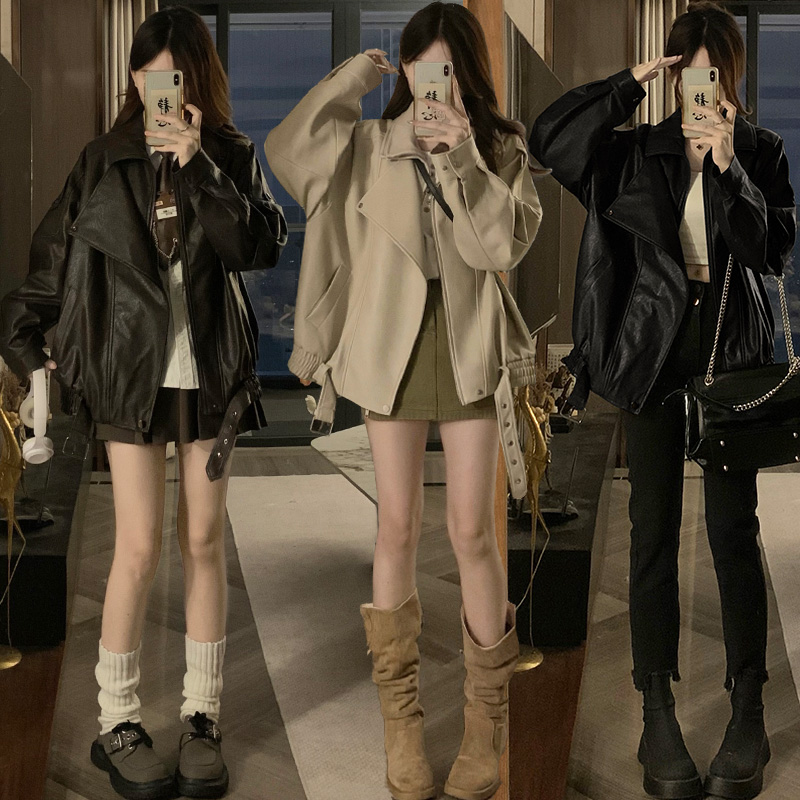 实拍 秋冬复古重工PU皮衣外套女机车服廓形双层领夹克情侣款上衣