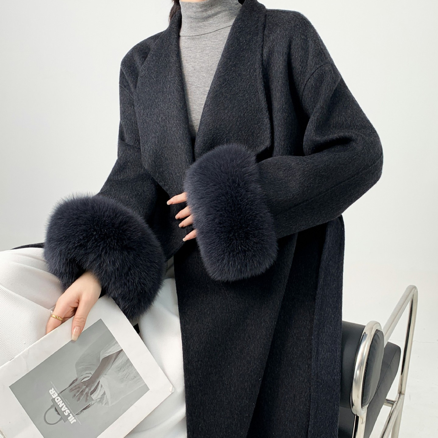 毛呢大衣女2025秋冬新款高阶时髦奢华加长款毛袖翻领呢大衣外套女