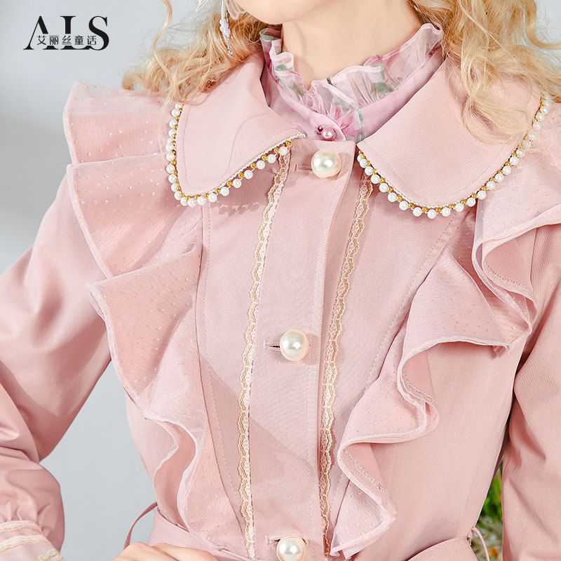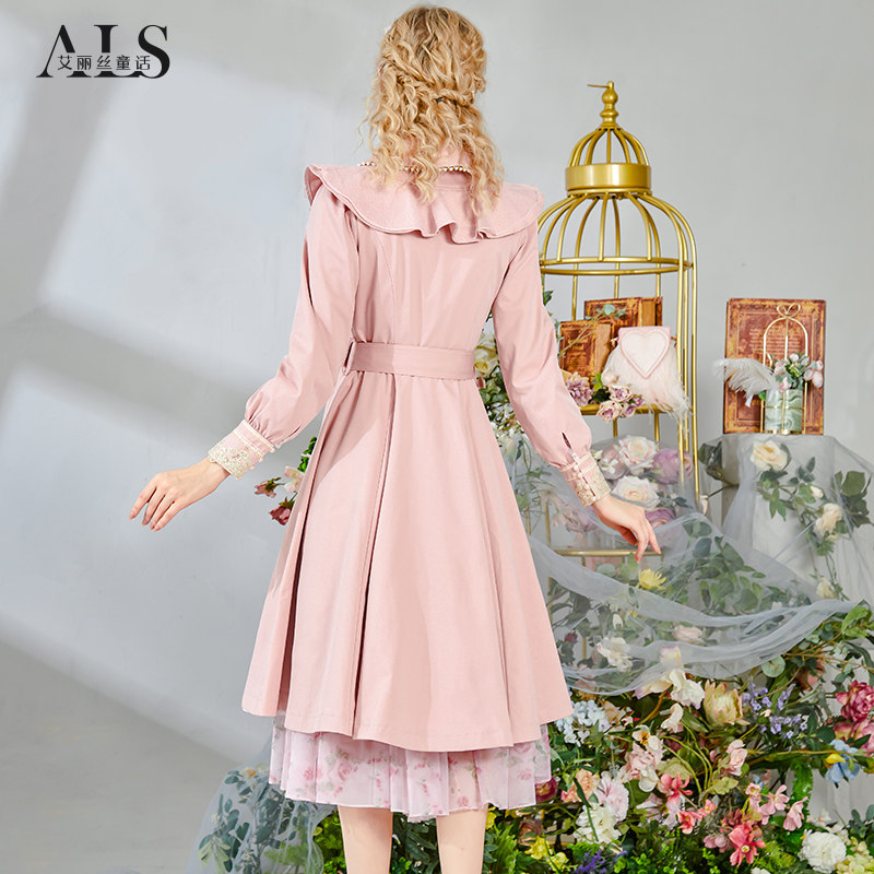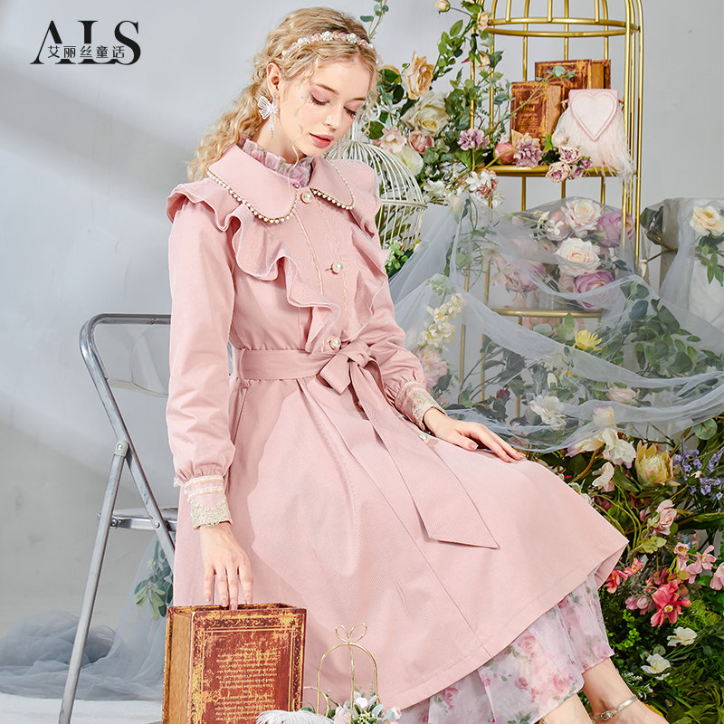艾丽丝2025冬季新款粉色甜美修身显瘦蝴蝶结绑带中长款风衣外套女
